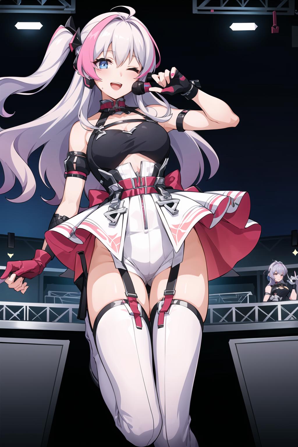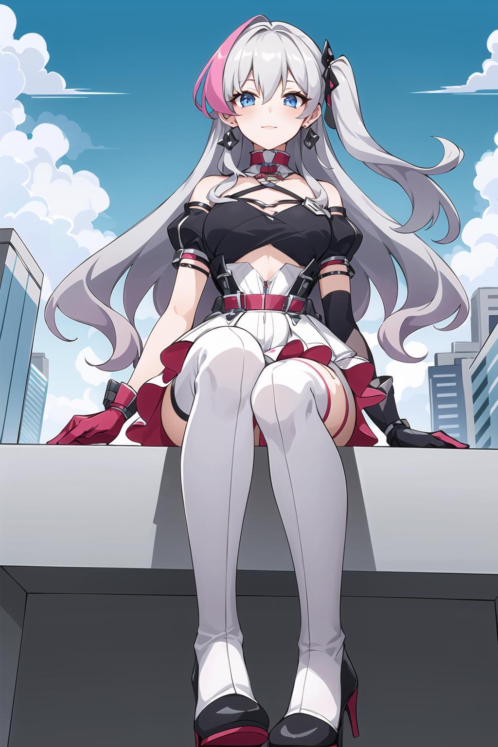 人物特征提示词:1girl, solo,thigh boots, gloves, streaked hair,long hair, blue eyes, grey hair, fingerless gloves,multicolored hair, breasts, pink hair, black gloves, one side up, skirt, white thighhighs, white footwear, high heels