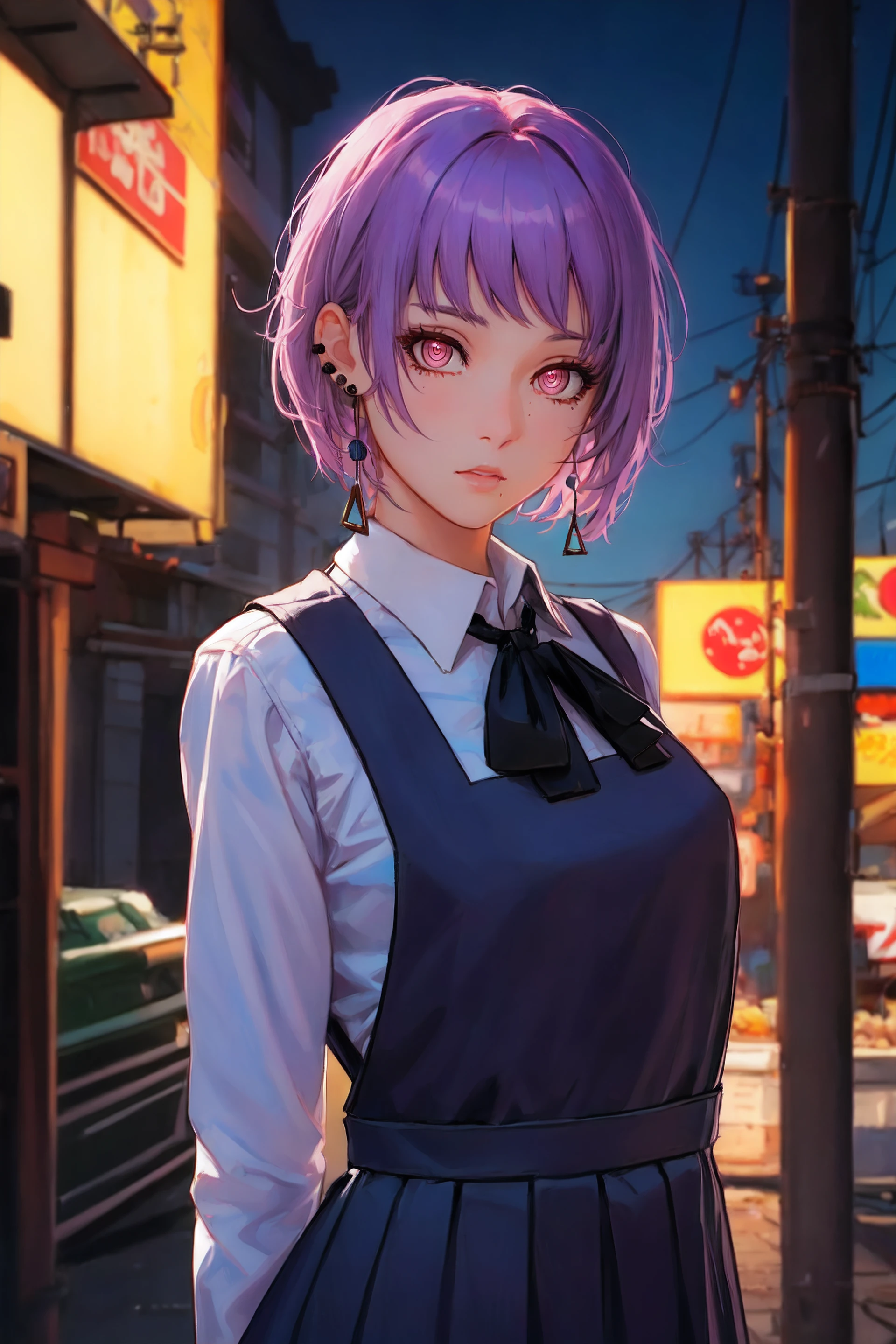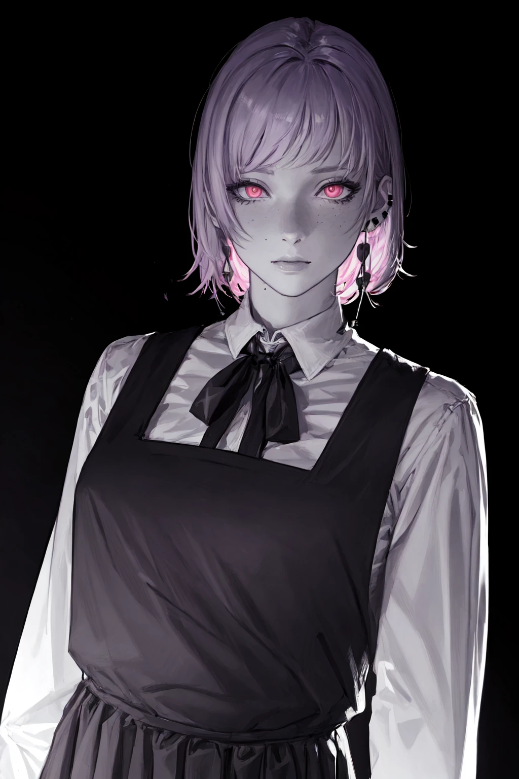 1girl, aged_up, solo, looking at viewer, fami, ringed eyes, pink eyes, short hair, pale_purple_hair, earrings, ribbon, black ribbon, black pinafore dress, pinafore dress, black belt