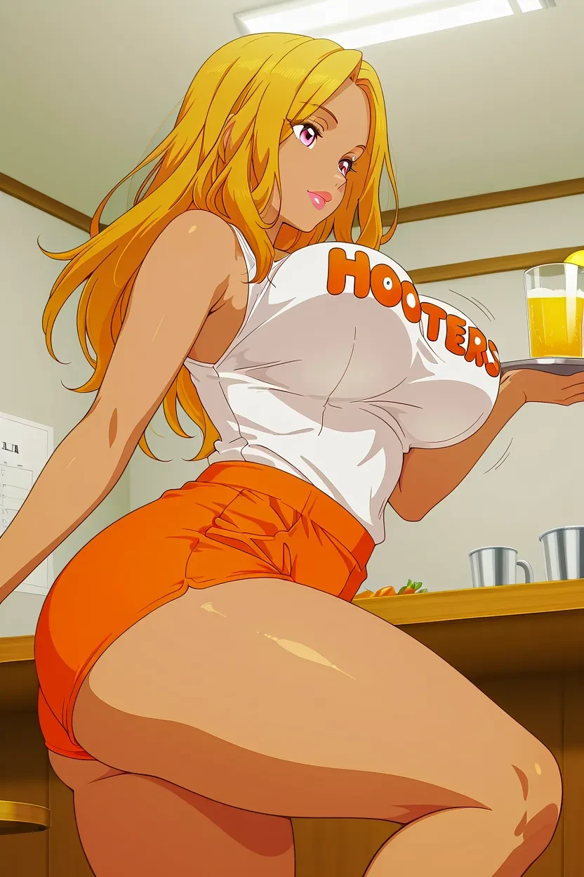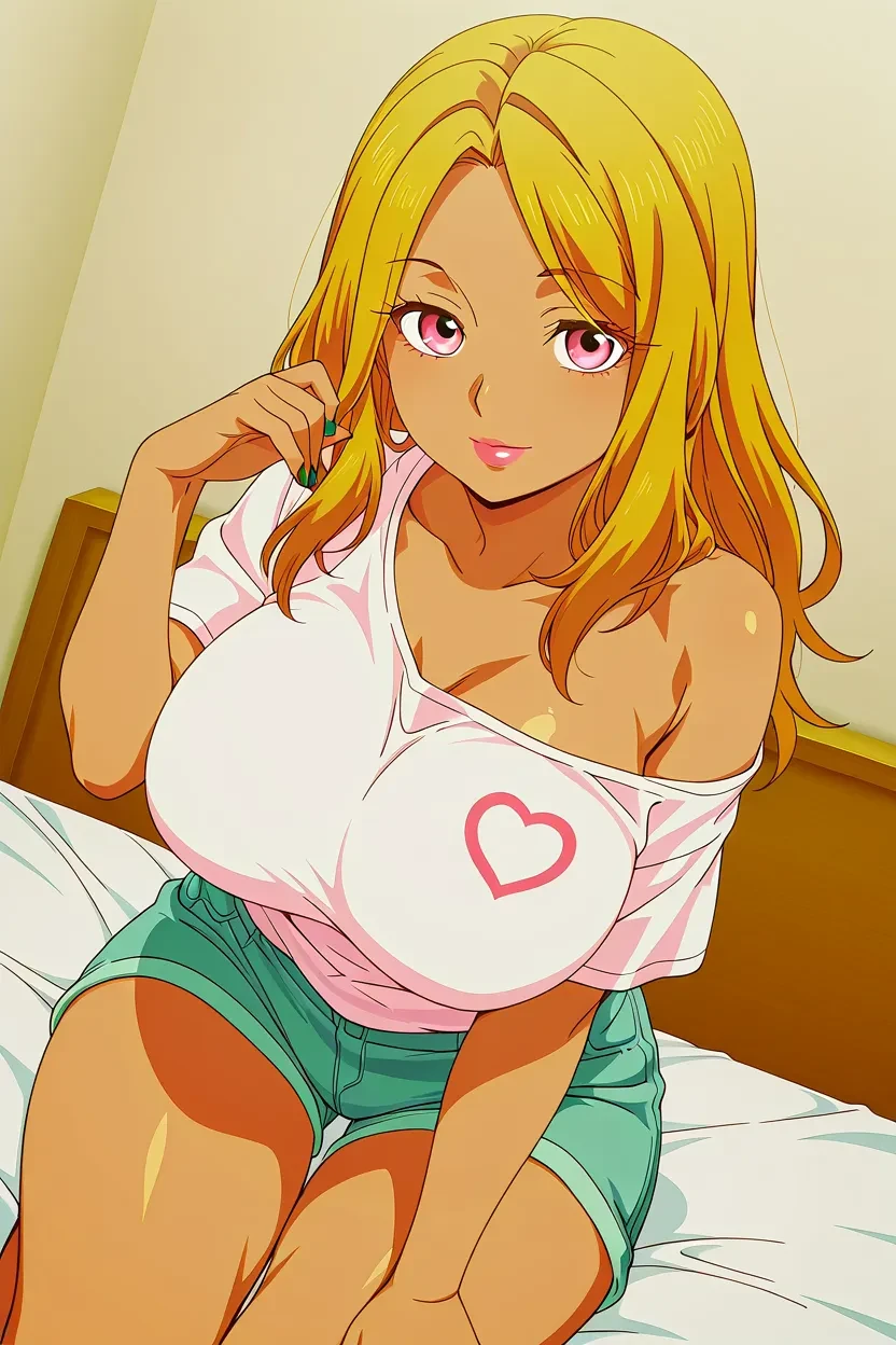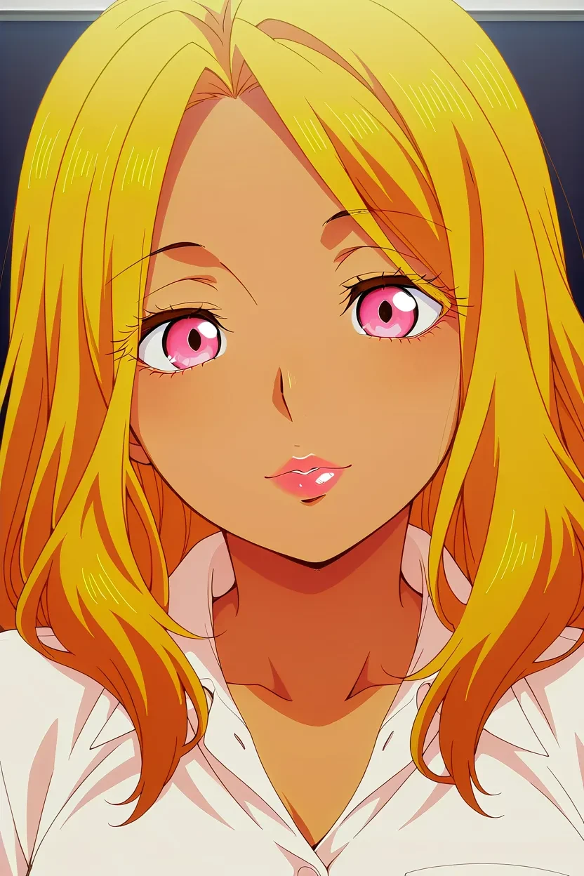 1girl, Rikka Yanagi, pink_eyes, blonde_hair, long_hair, dark_skin, dark-skinned_female, lips, glossy_lips, massive_, curvy, extremely , wide_, thick_thighs, wide_,