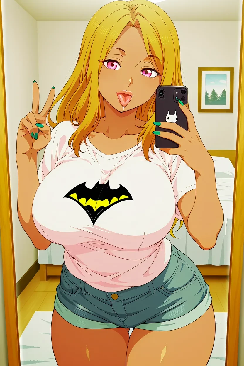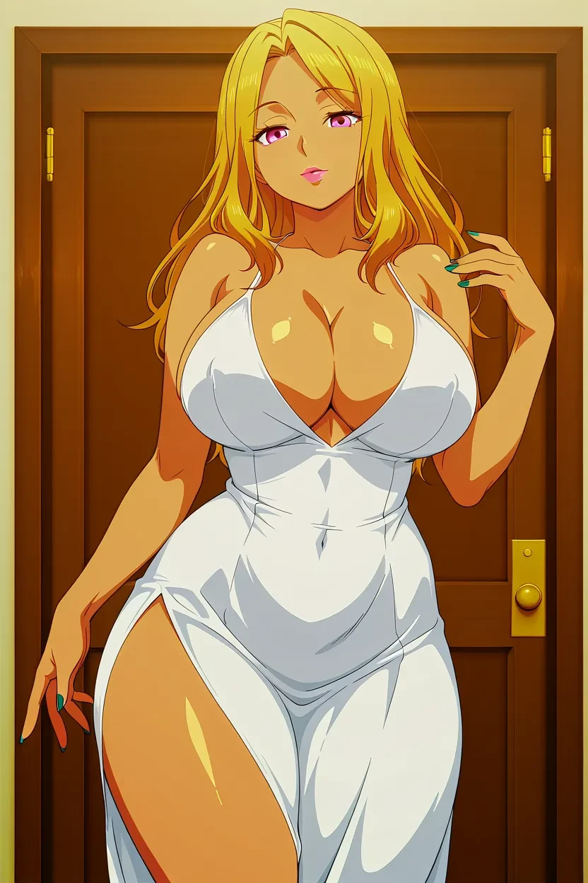 1girl, Rikka Yanagi, pink_eyes, blonde_hair, long_hair, dark_skin, dark-skinned_female, lips, glossy_lips, massive_, curvy, extremely , wide_, thick_thighs, wide_, , fully , ,