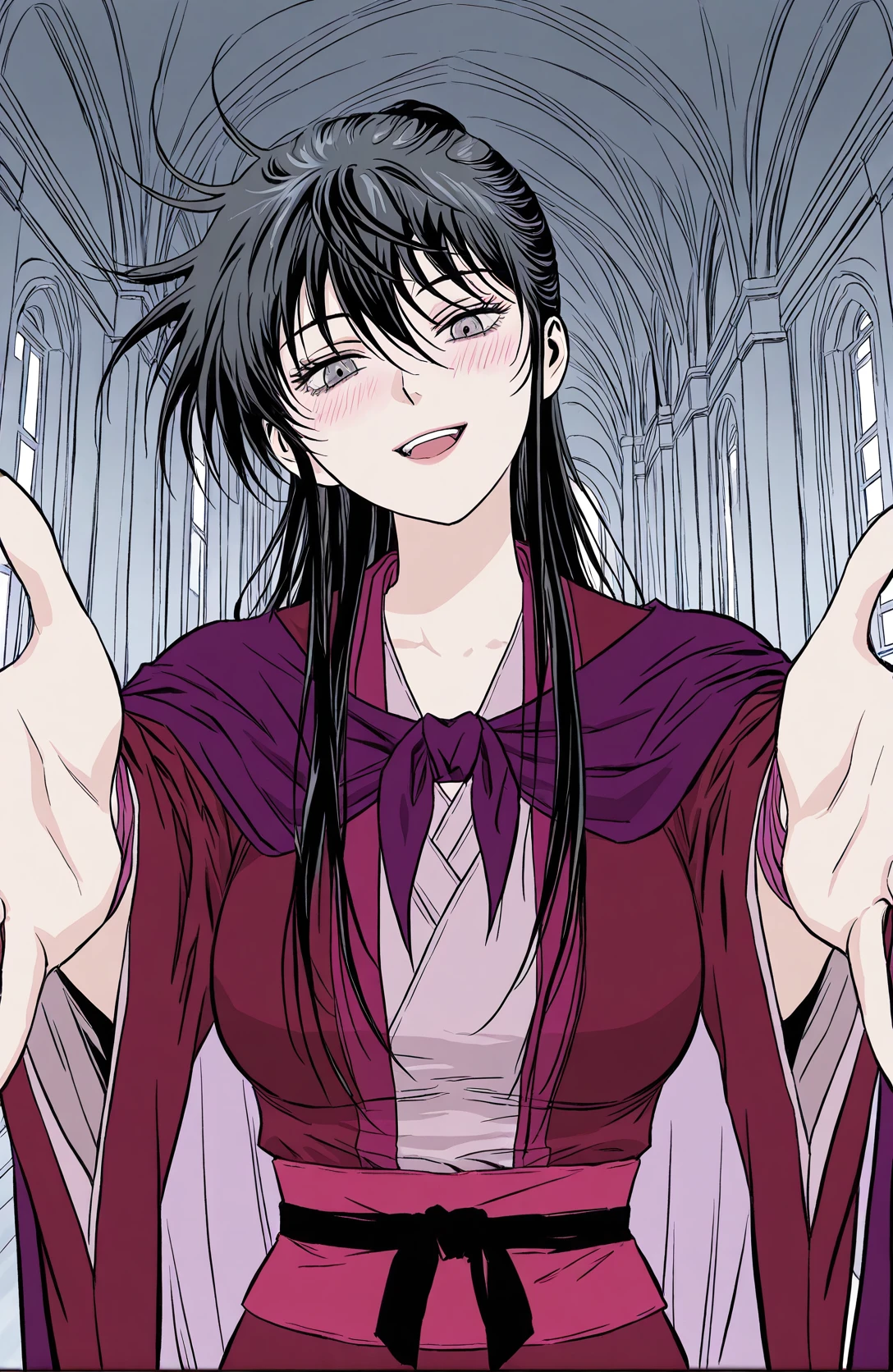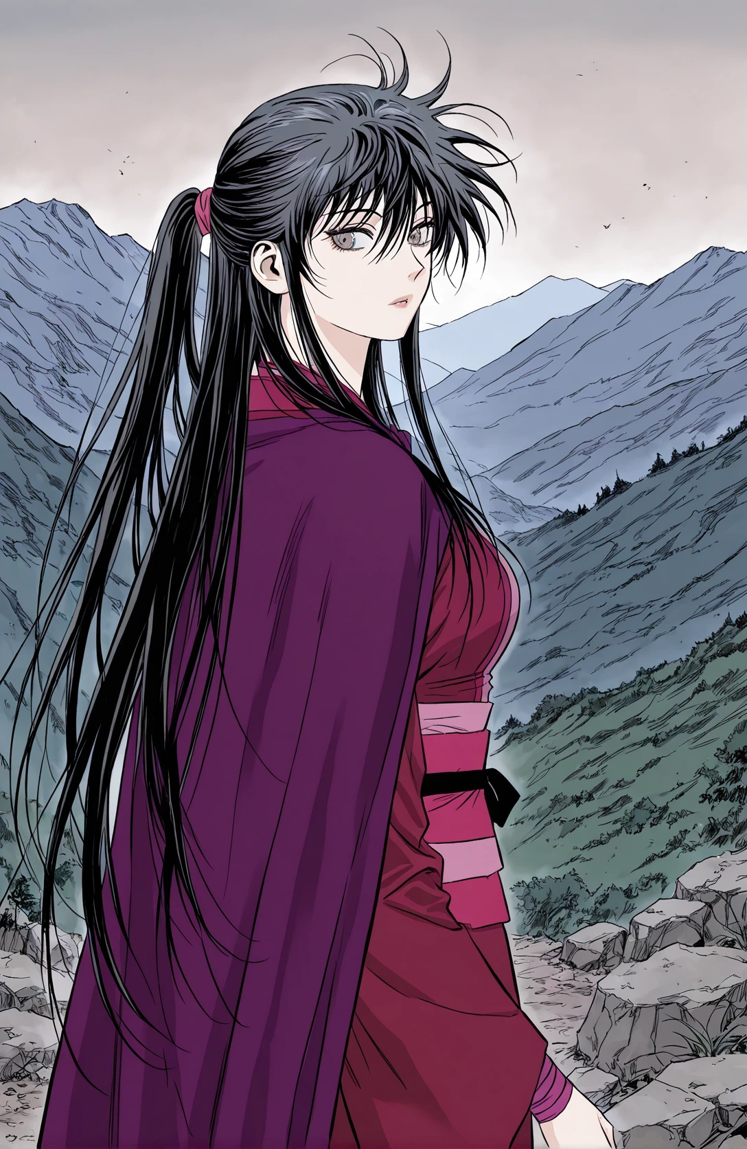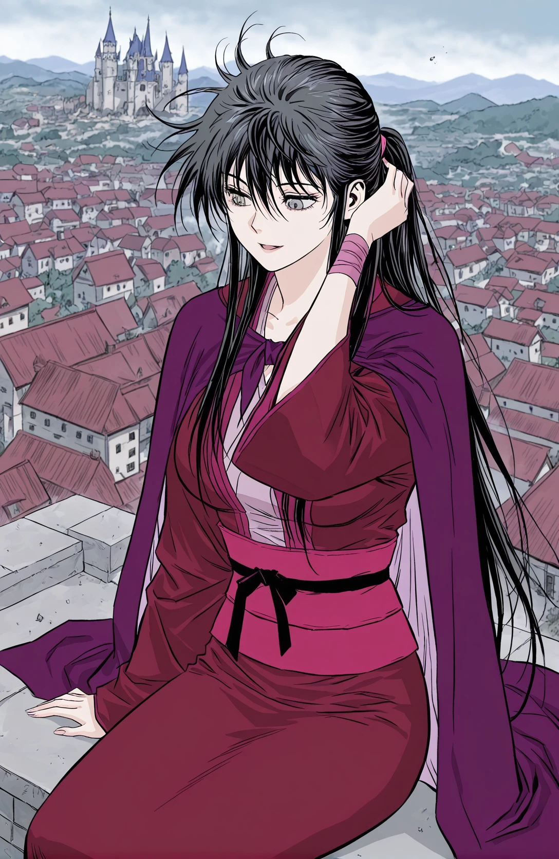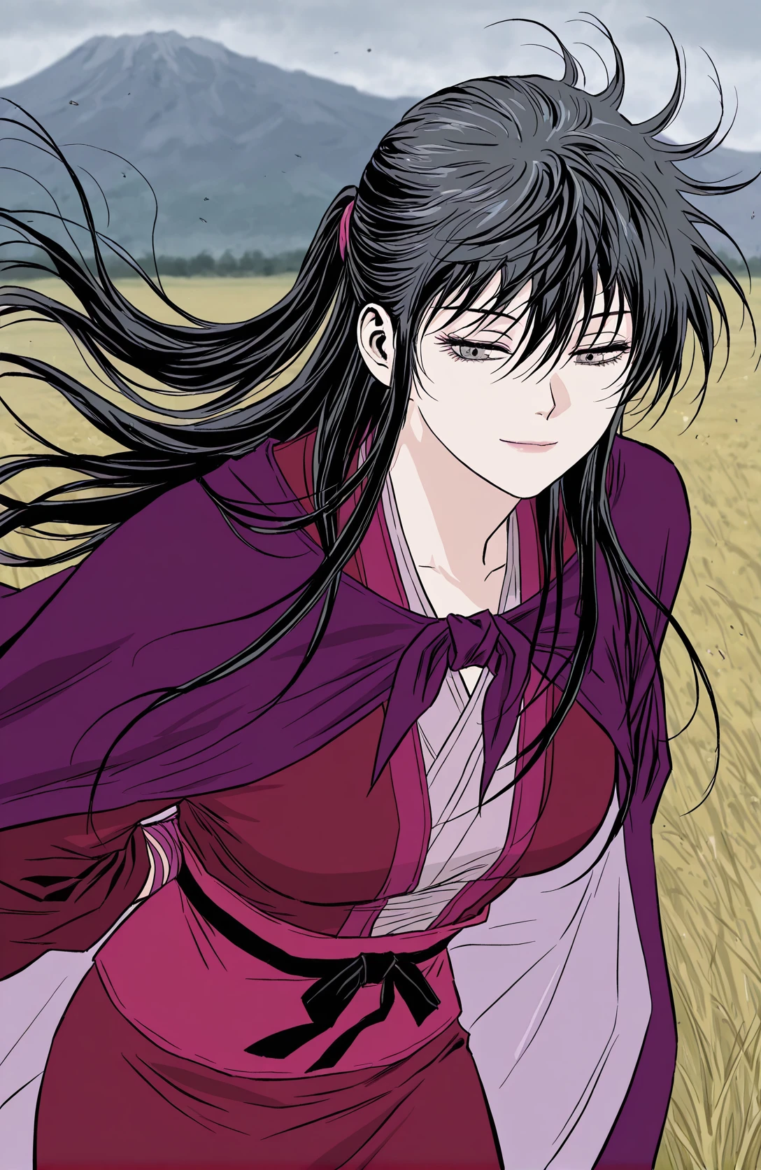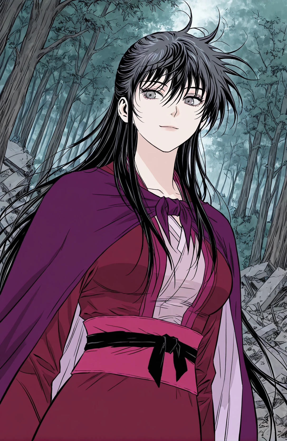 Garyeong_outfit, purple cape, long cape, red kimono, long kimono, long sleeves, wide sleeves, pink inner top, dark pink waist sash, black waist sash, ligh pink wrist wraps,