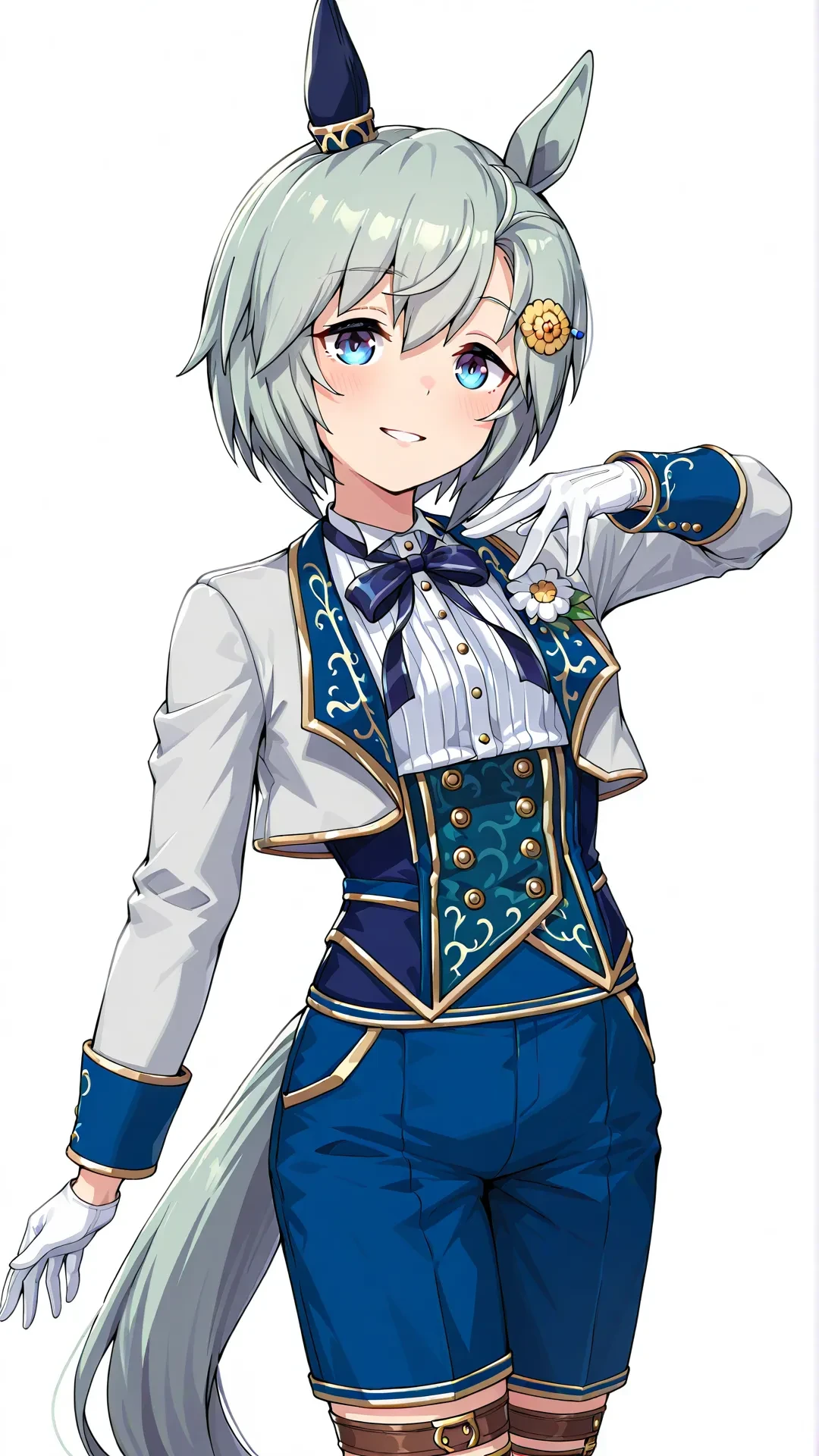 official alternate costume,single ear cover,neck ribbon,white jacket,flower,cropped jacket,open jacket,long sleeves,white gloves,collared shirt,white shirt,blue vest,buttons,underbust,blue pants,thigh strap,legwear garter,kneehighs,blue footwear,