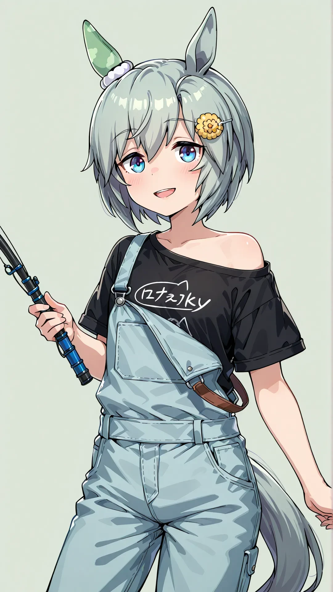 casual,single ear cover,hair flower,hairclip,black shirt,t-shirt,clothes writing,one-side off shoulder,short sleeves,overalls,suspenders pants,white footwear,sneakers,