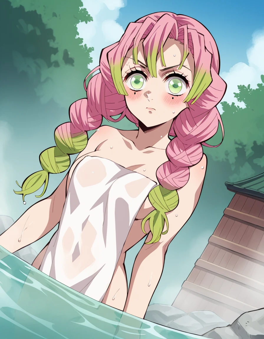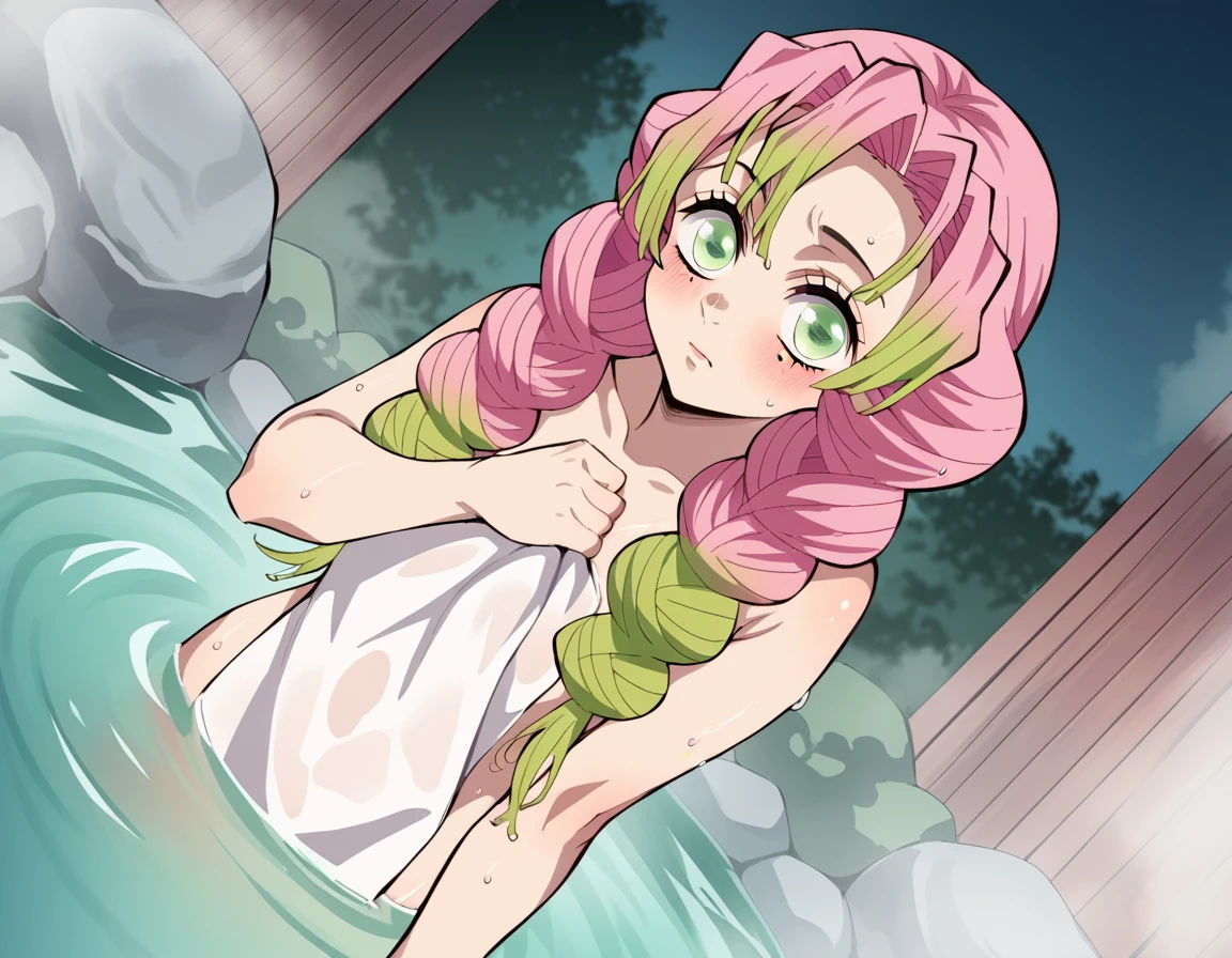 mitsuri kanroji, braid, gradient hair, green eyes, green hair, long hair, mole, mole under eye, multicolored hair, pink hair, twin braids, two-tone hair,