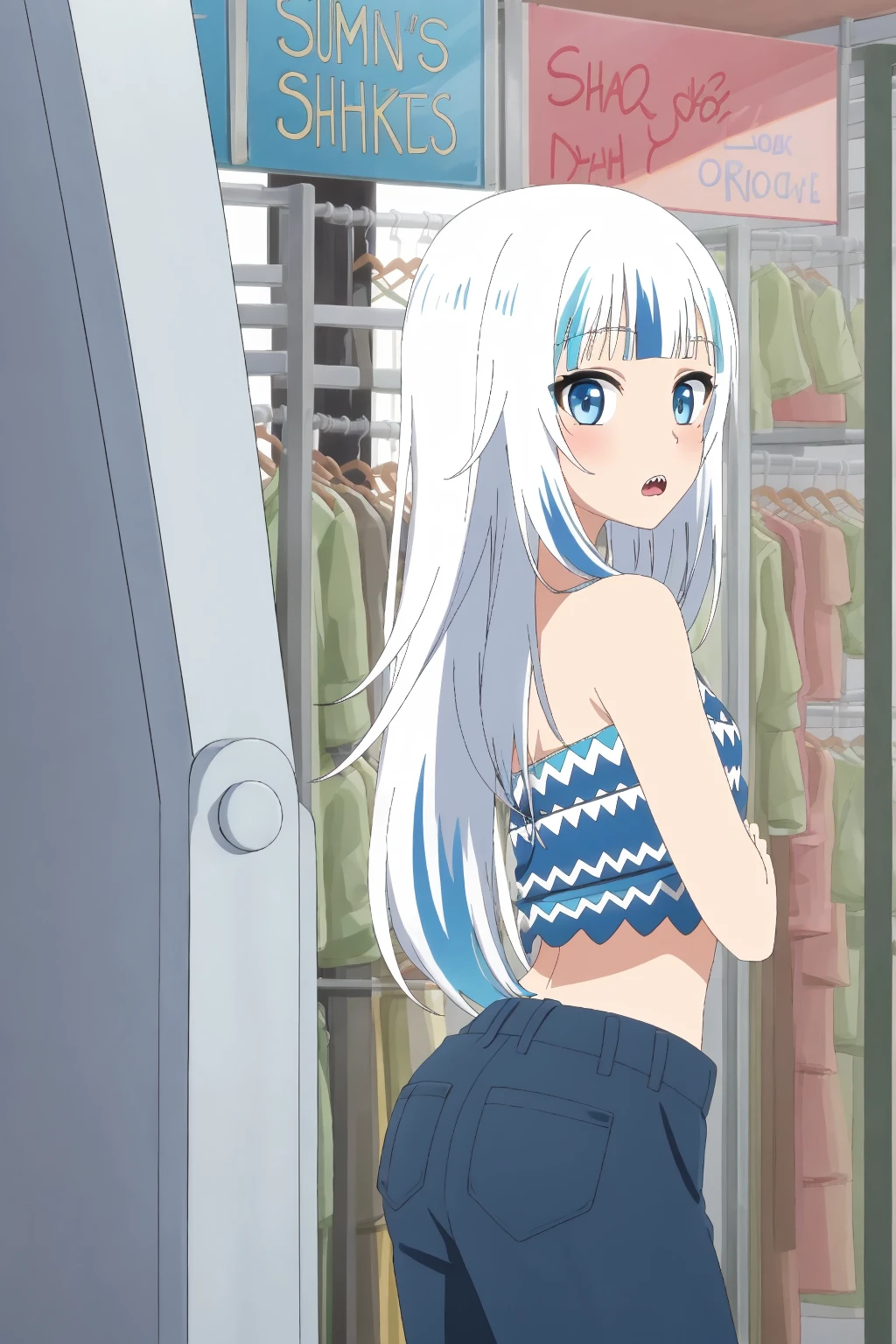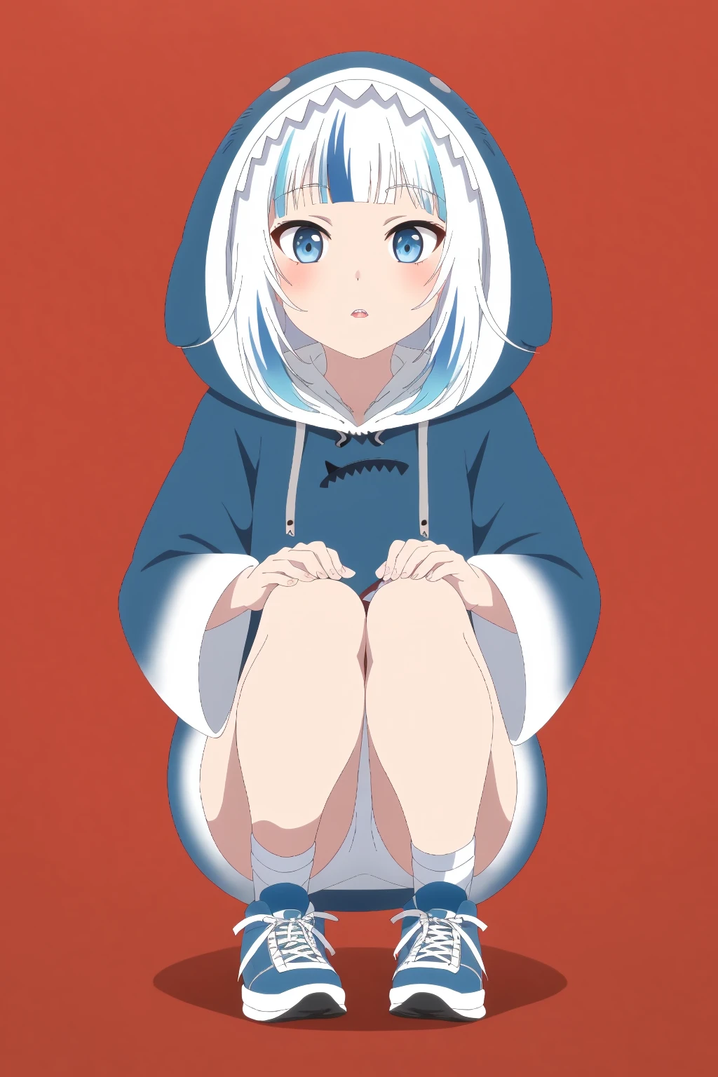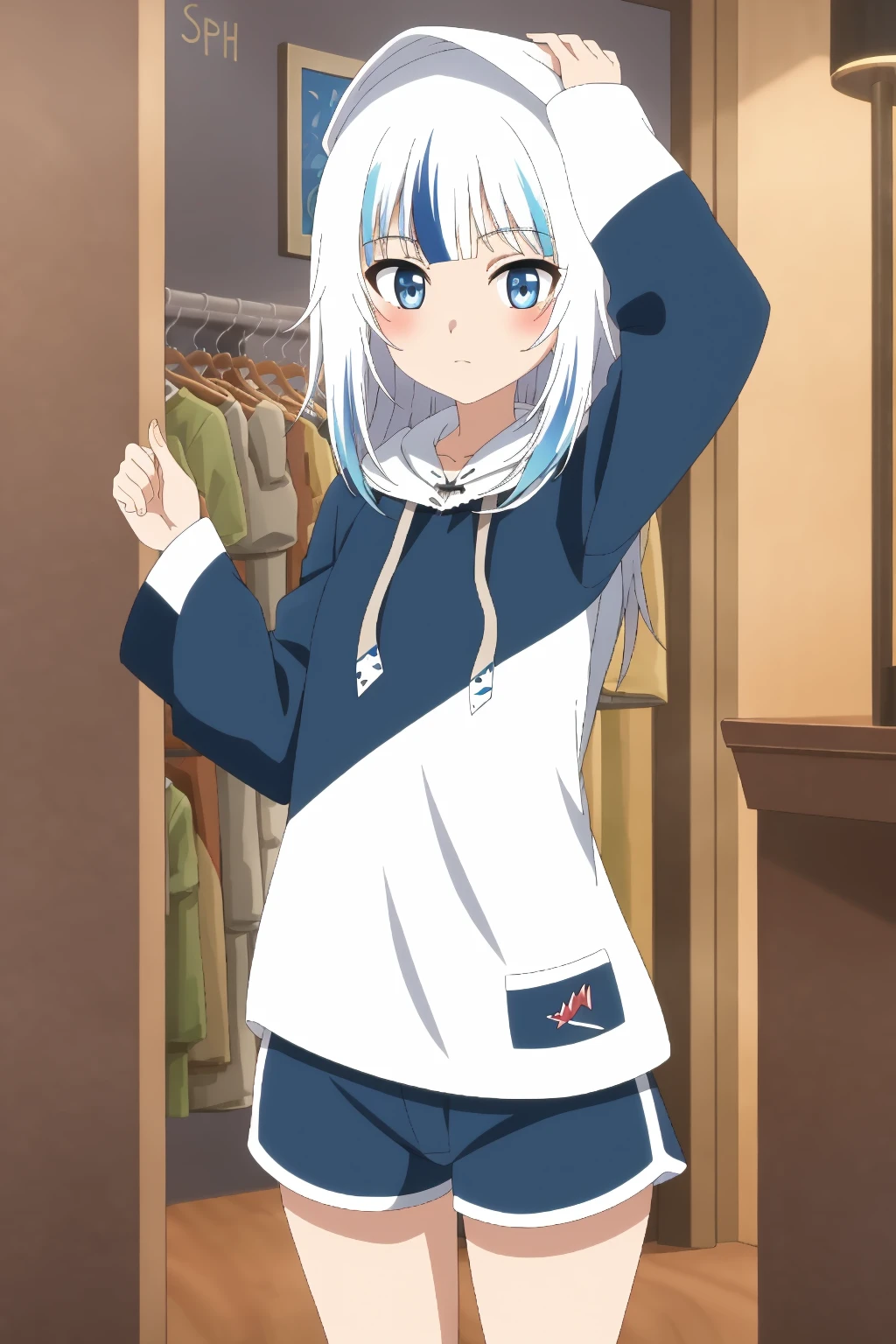 Gura, blue eyes, multicolored hair, white hair, streaked hair, blue hair, blunt bangs, two-tone hair, medium hair, shark hair ornament,
