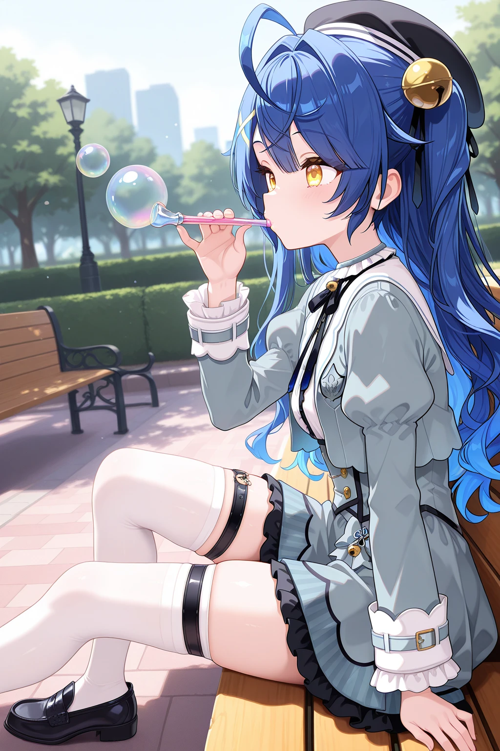 long hair, blue hair, two side up, wavy hair, yellow eyes, mini wings, black headwear, x hair ornament, hair bell, grey jacket, puffy sleeves, frilled sleeves, cropped jacket, open jacket, neck bell, white shirt, grey dress, white thighhighs, thigh strap, loafers
