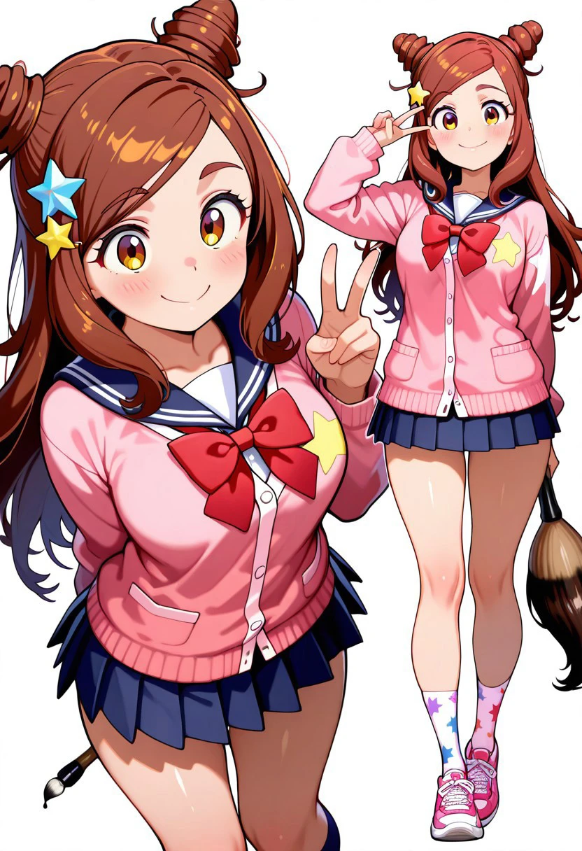 1girl, solo, iroha_asobe, brown hair, cone hair bun, long hair, yellow eyes, medium breasts, star hair ornament,