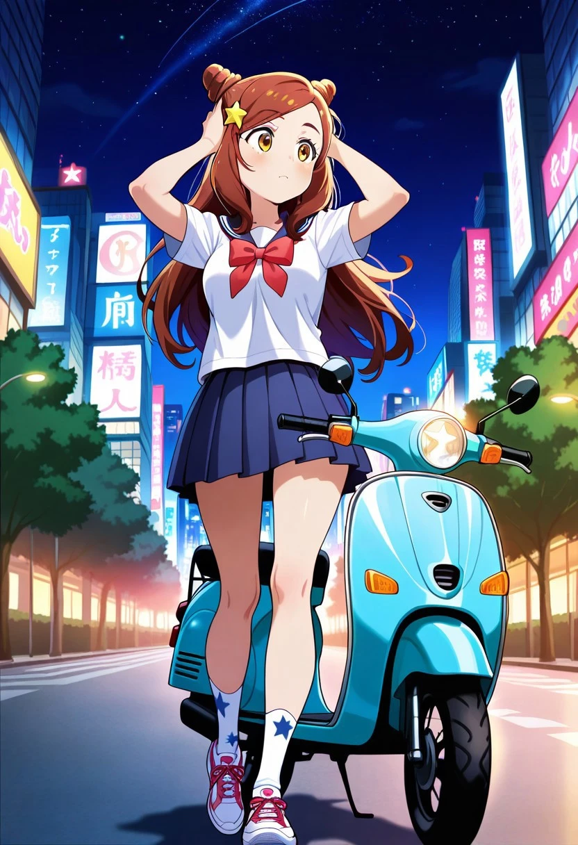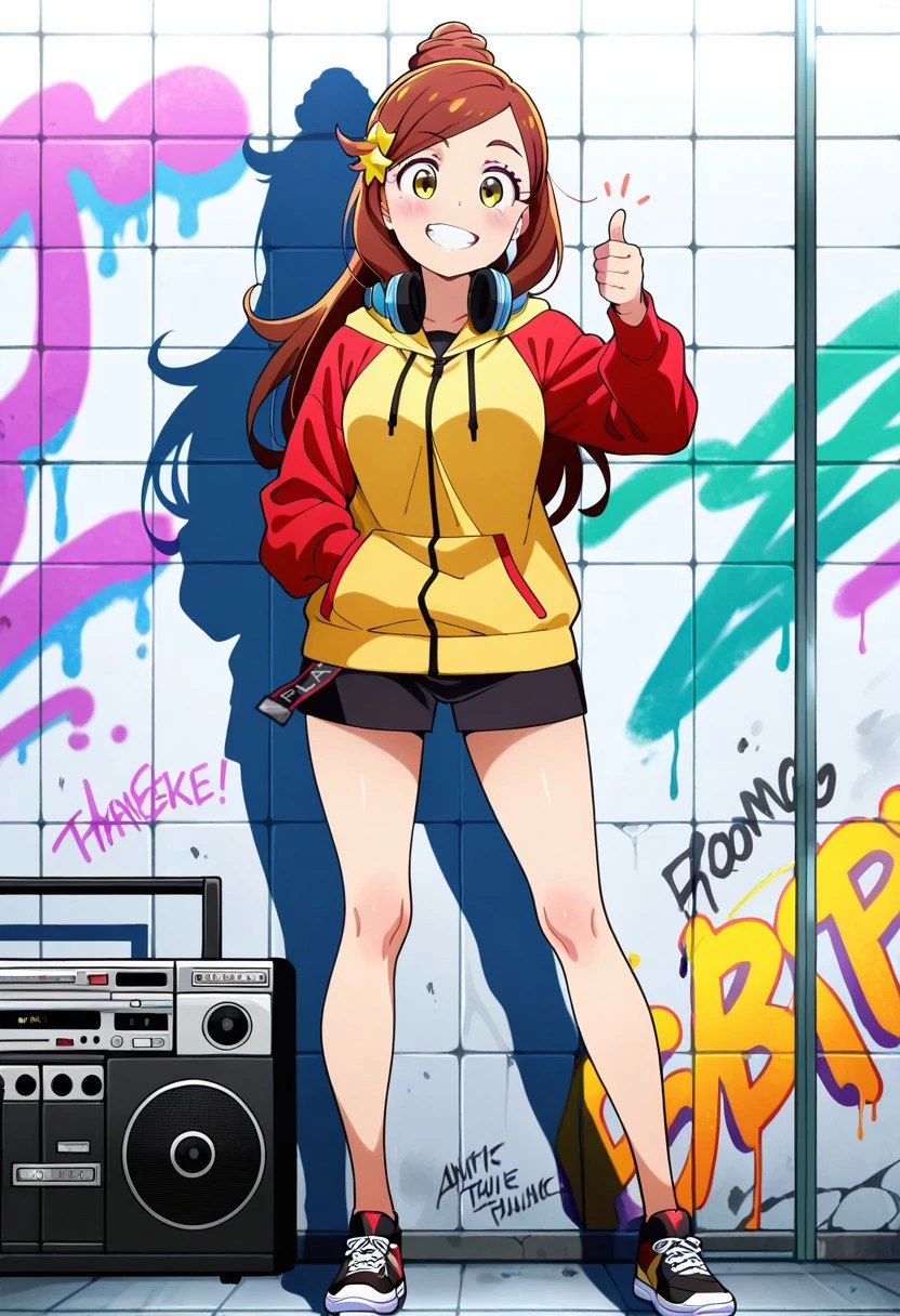 brown hair, yellow eyes, long hair, ponytail, star hair ornament, yellow hoodie jacket with red sleeves, black short, short short, sneakers, [USED CHANGING: Ponytail in replace for cone hair bun]