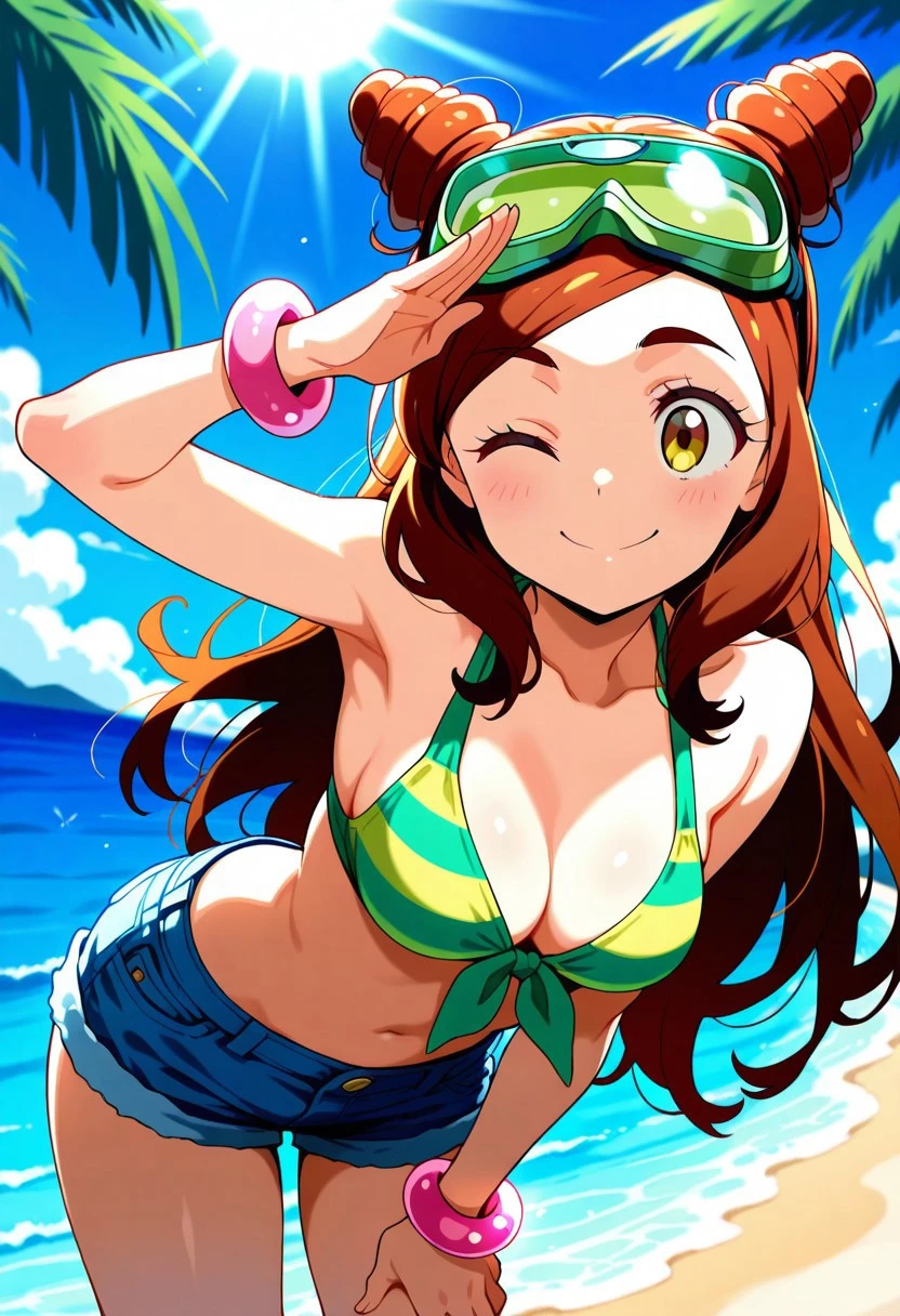 green and yellow striped swimsuit, front-tie bikini top, navel, cleavage, denim shorts, blue shorts, puffy bracelet, pink bracelet,green diving mask, goggles on head, sandals,