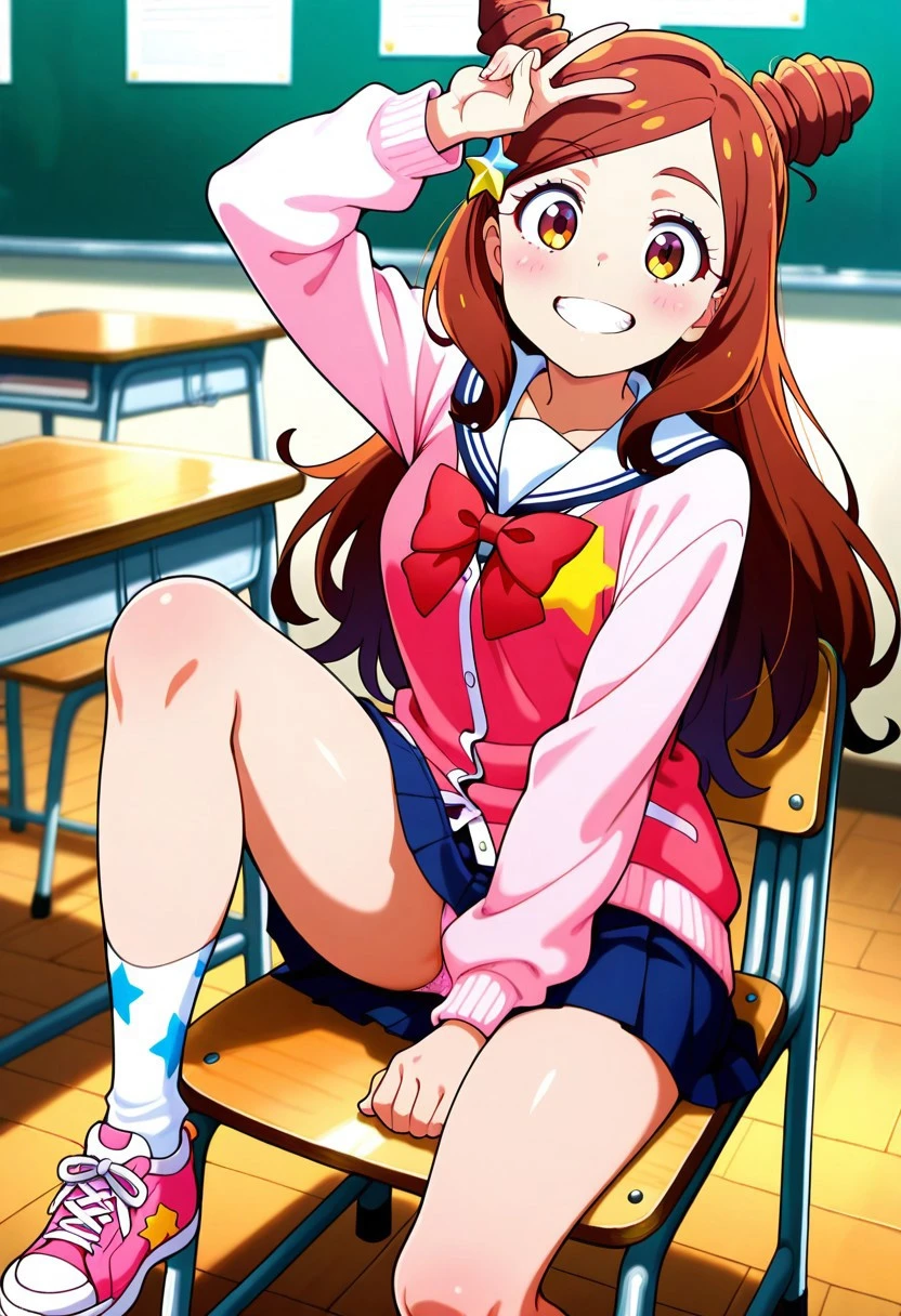 school uniform, star hair ornament, pink cardigan, long sleeves, sailor collar, red bowtie, pleated skirt, miniskirt, blue skirt, socks, star print, sneakers, star \(symbol\)