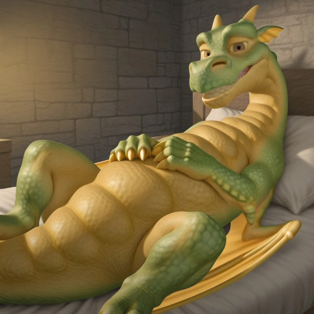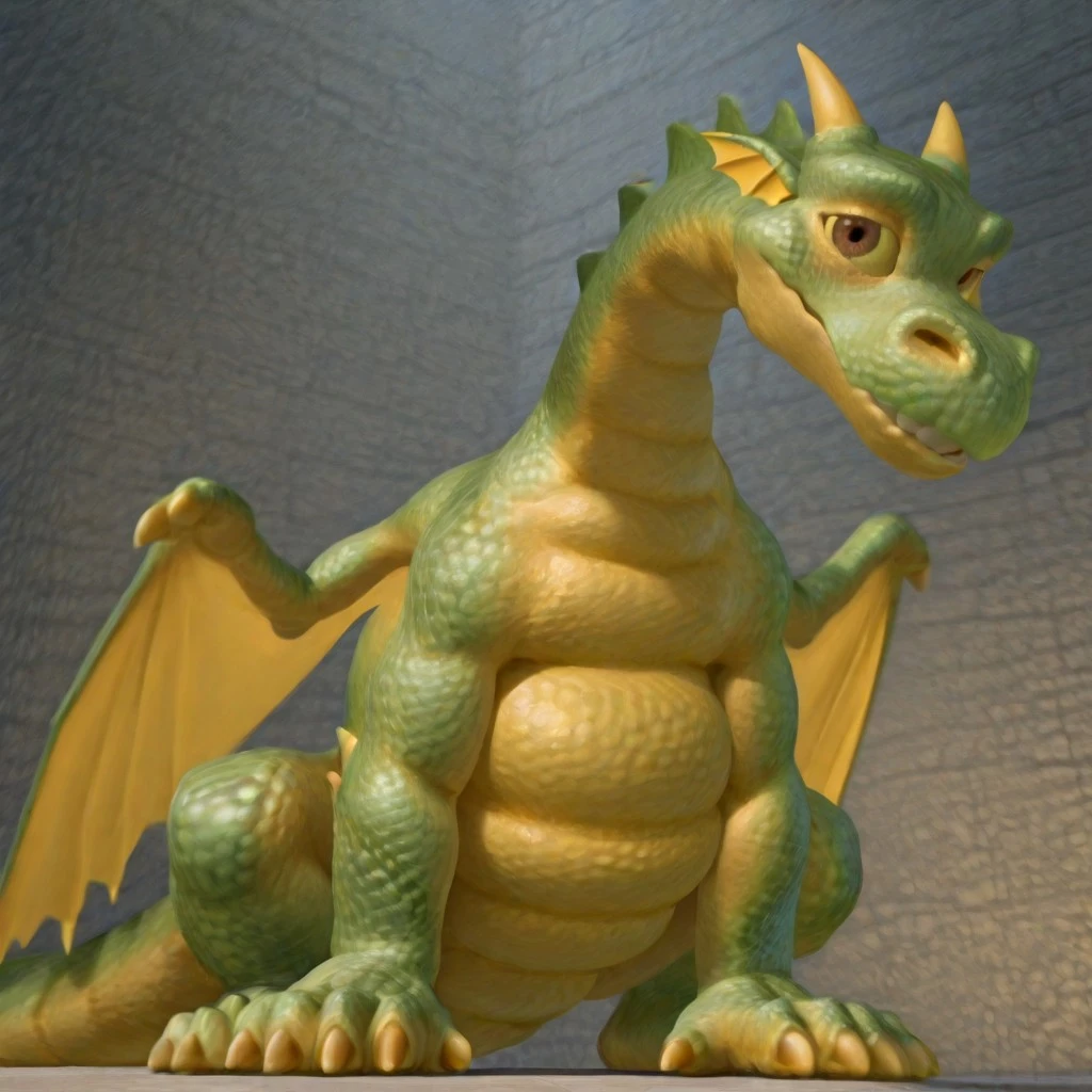 Tags: JATD_Dragon, dragon, scalie, feral, green scales, yellow countershading, yellow belly scales, head fins, long tail, horns, wings, yellow eyelids, big eyes, brown eyes, big snout, nostrils, wings, 5 fingers, 4 toes, claws, teeth, chubby
