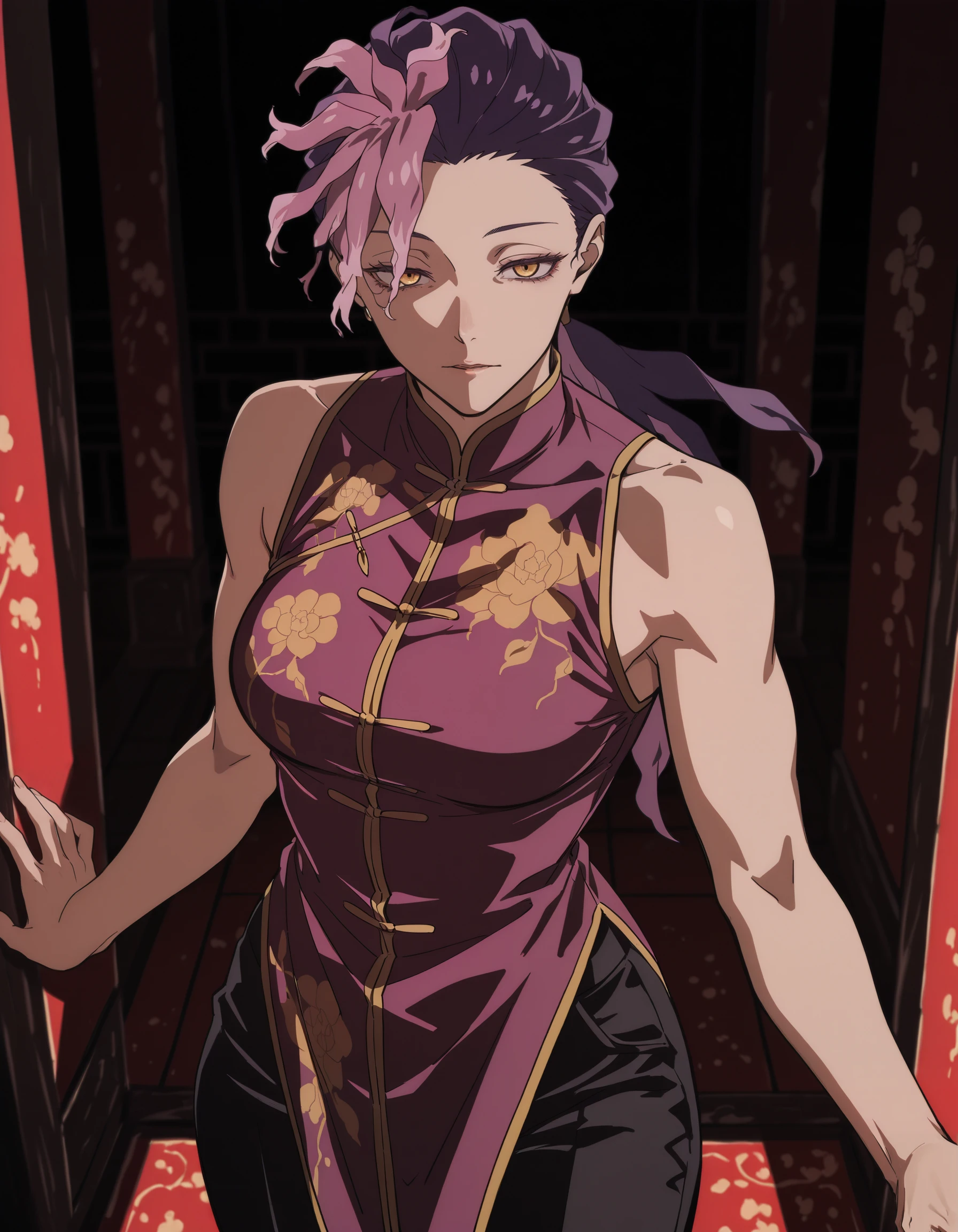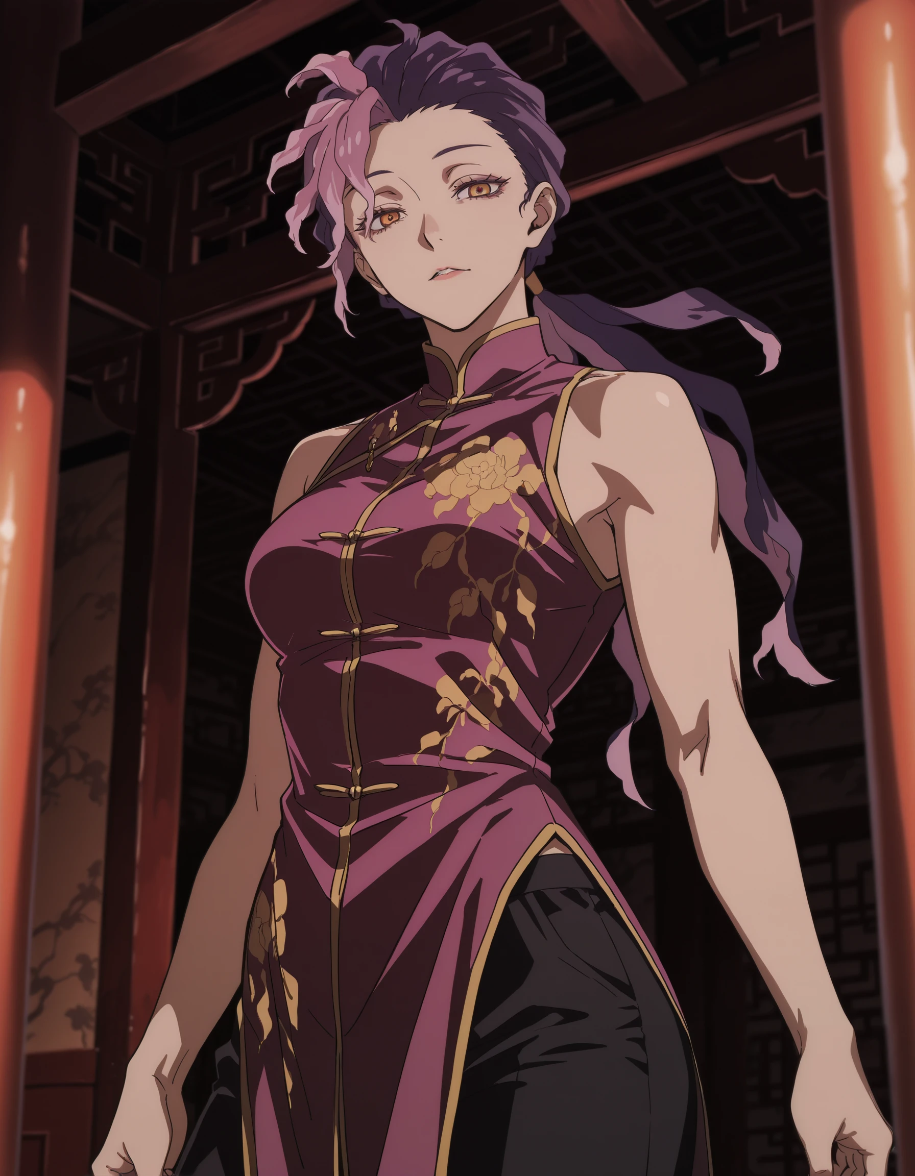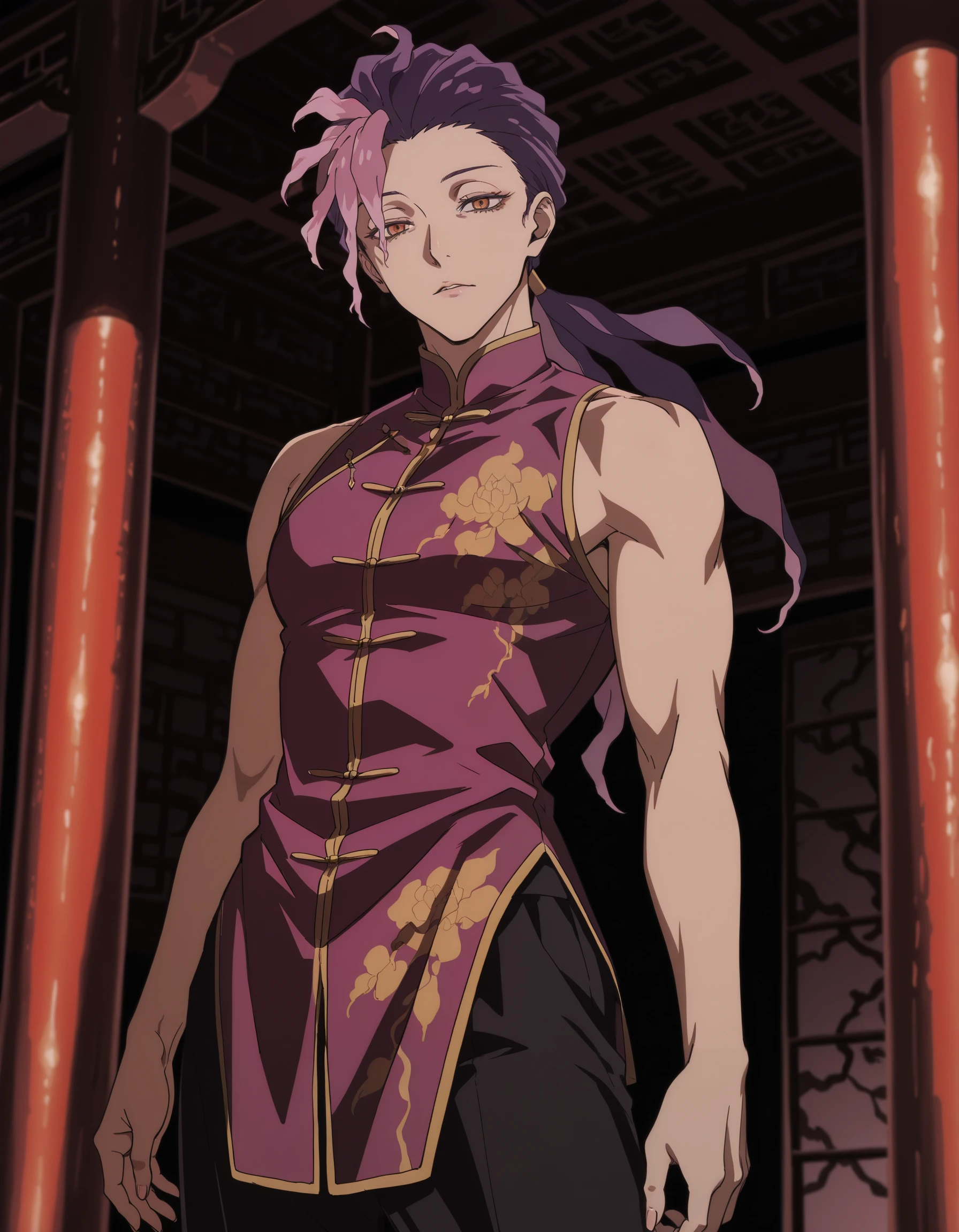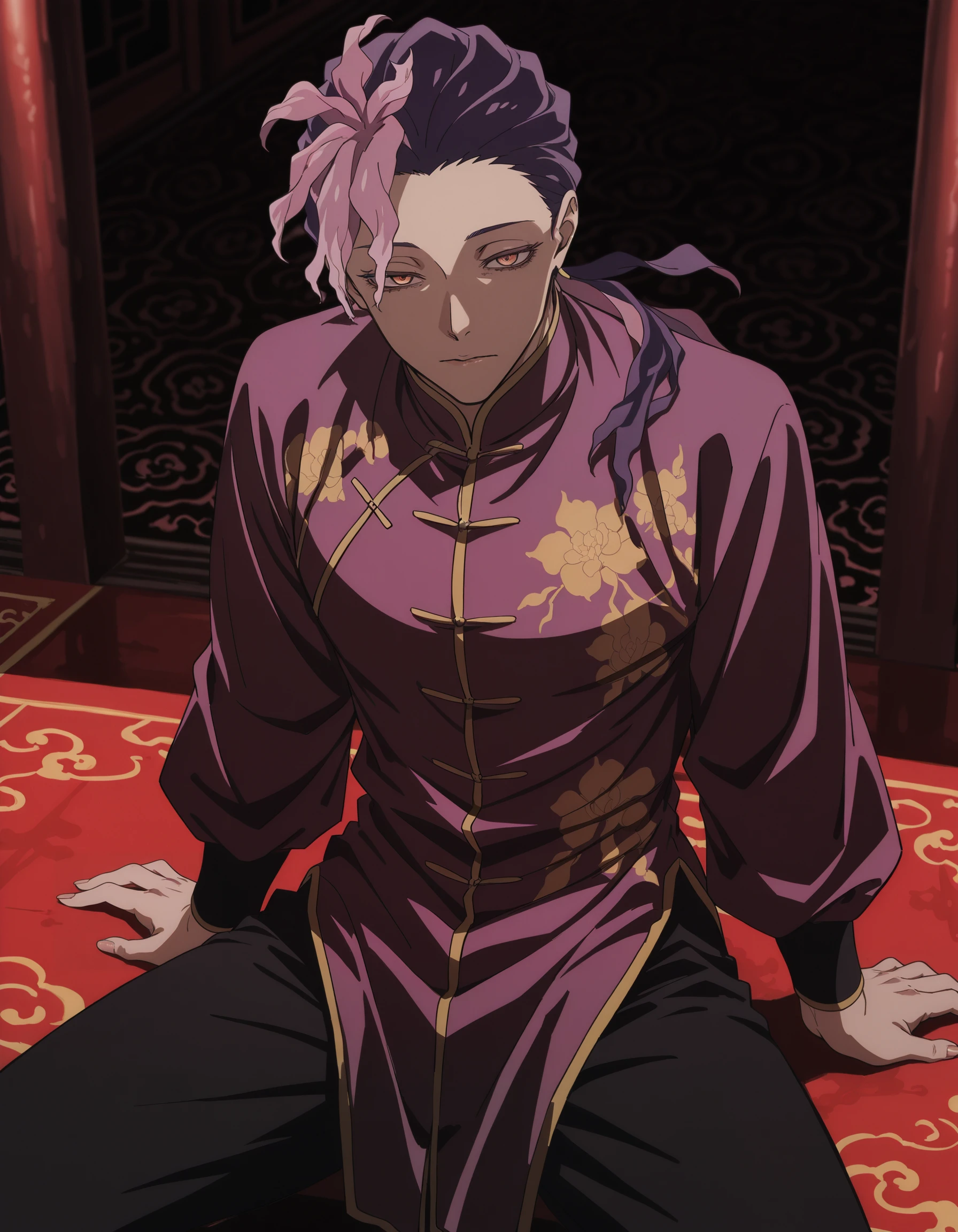 low ponytail, ran \(jigokuraku\), orange eyes, purple hair, pink hair, yellow eyes, chinese clothes, multicolored hair, black pants