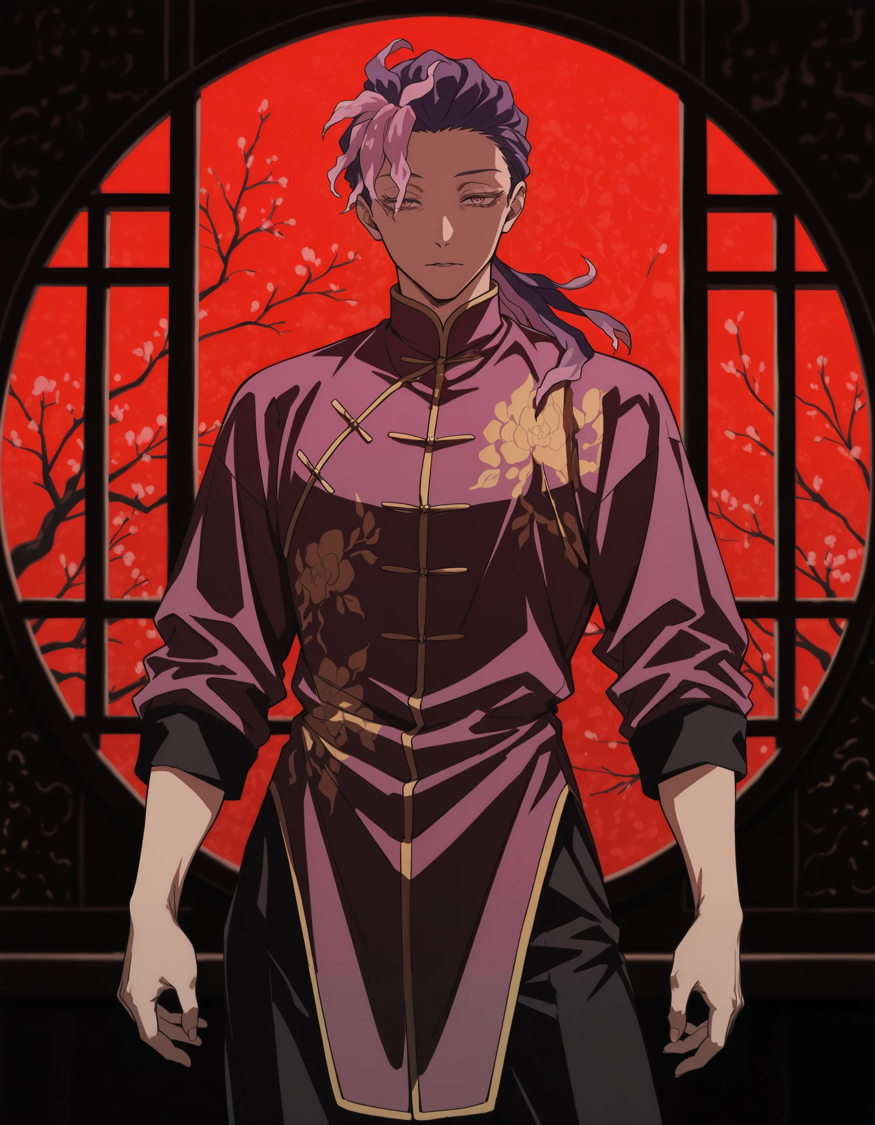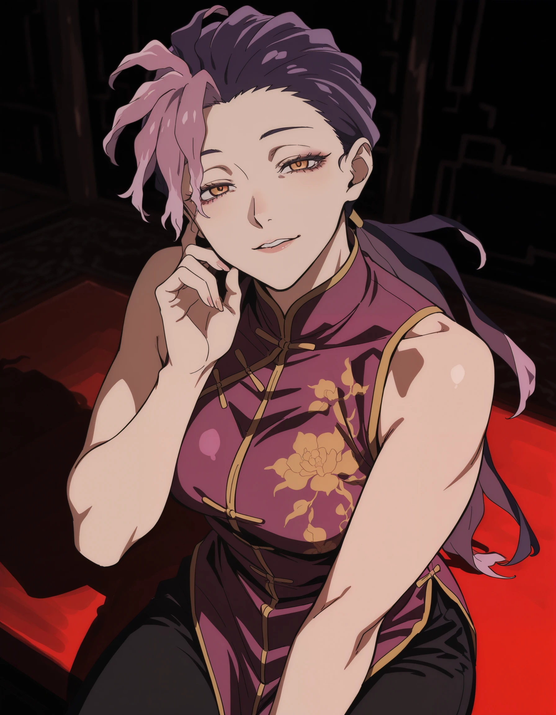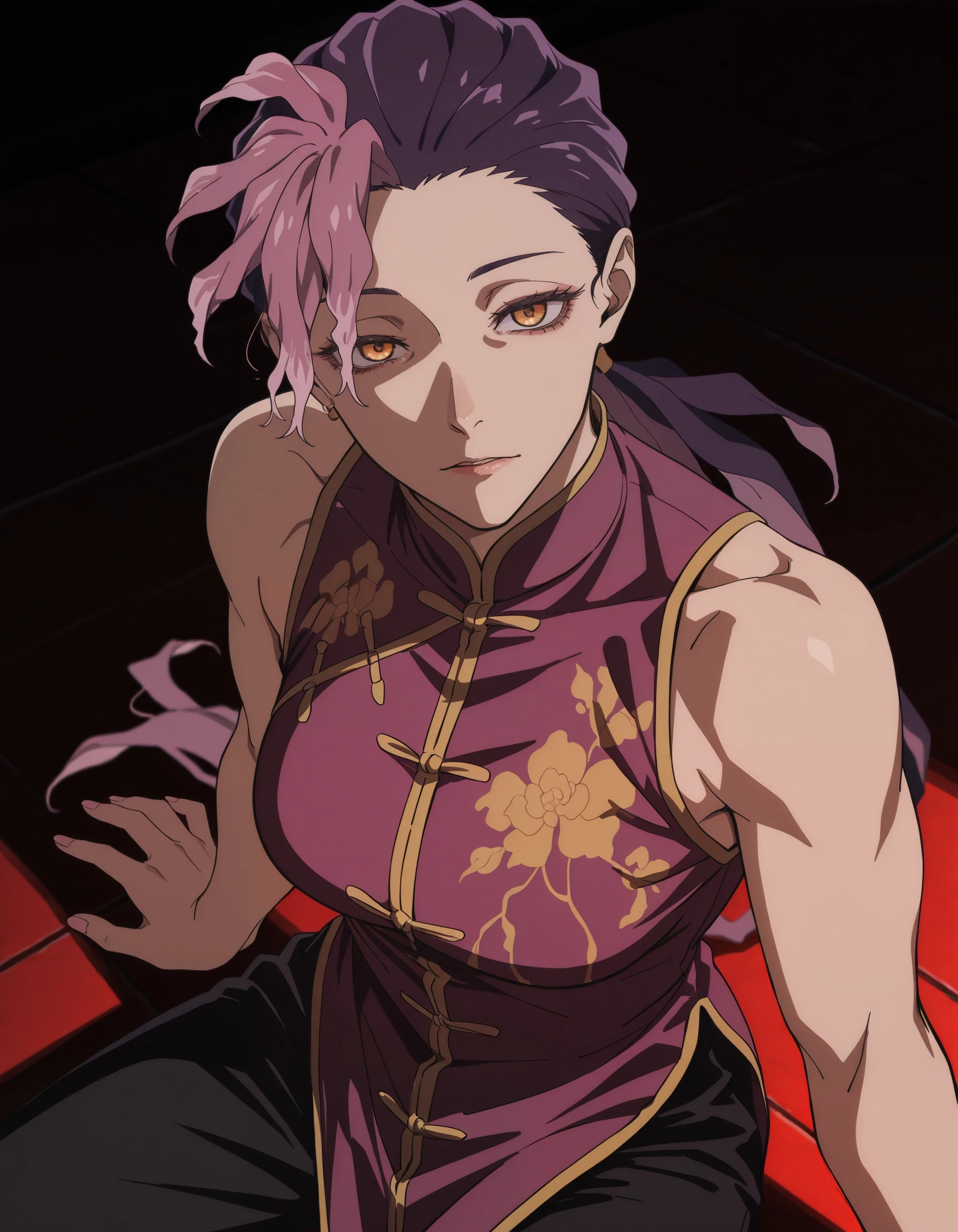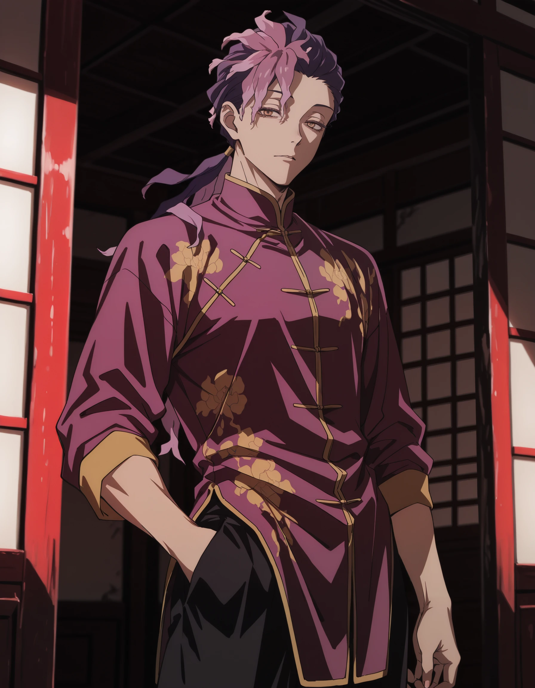 low ponytail, ran \(jigokuraku\), orange eyes, purple hair, pink hair, yellow eyes, chinese clothes, multicolored hair, black pants