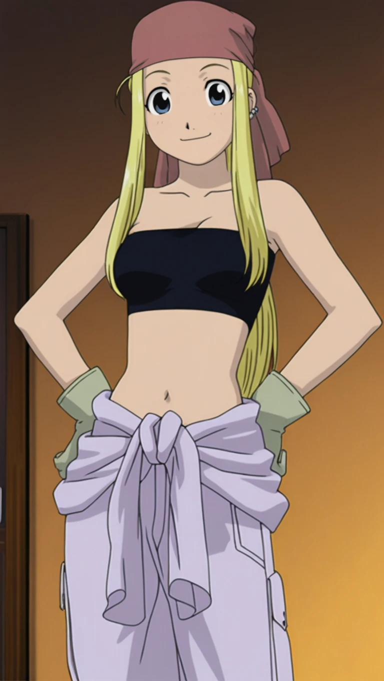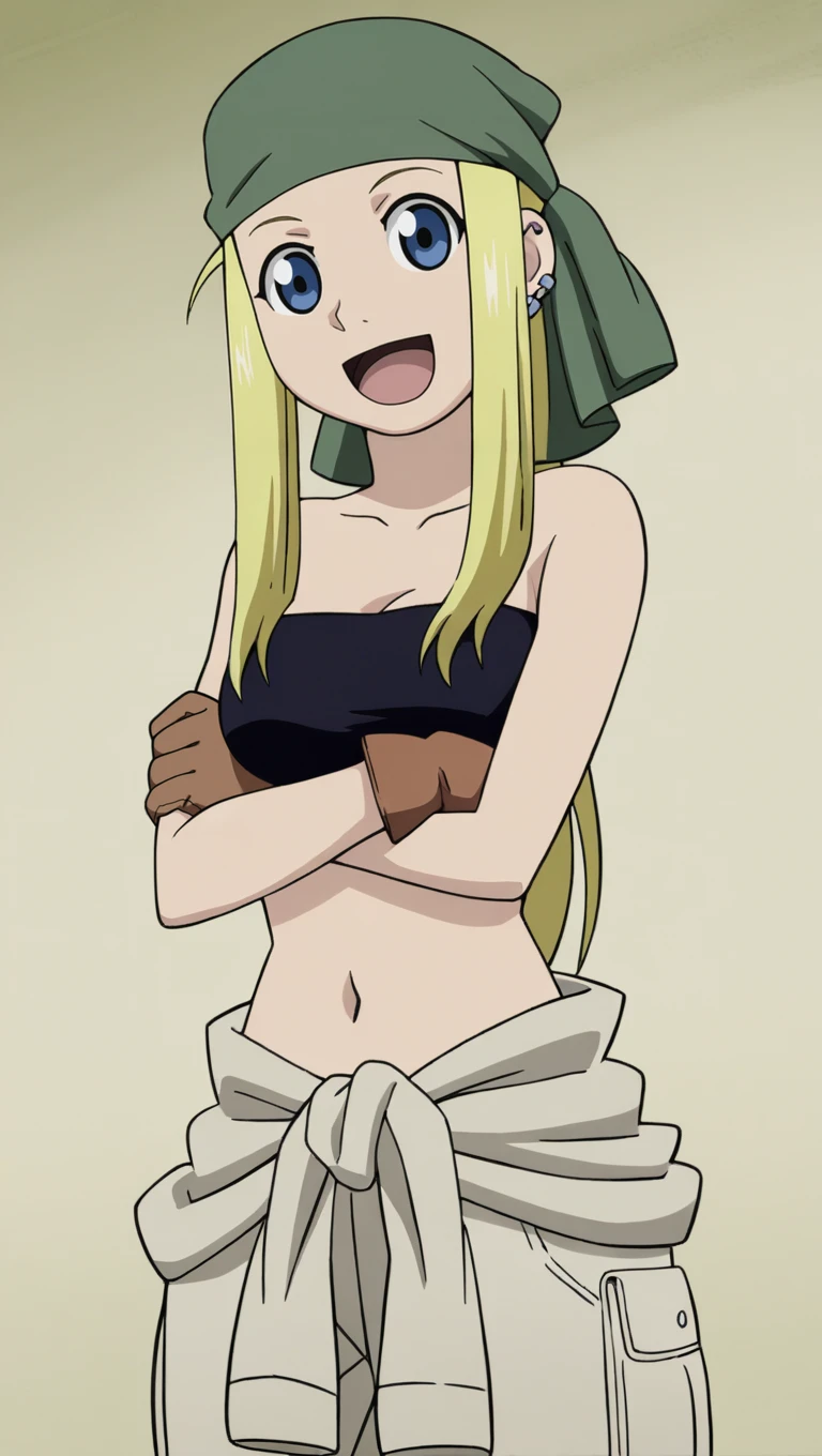 09 w05k, blue eyes, ponytail, green bandana, black bandeau, beige clothes around waist, beige pants, brown gloves, silver ear piercing, 09 style, navel, medium breasts,