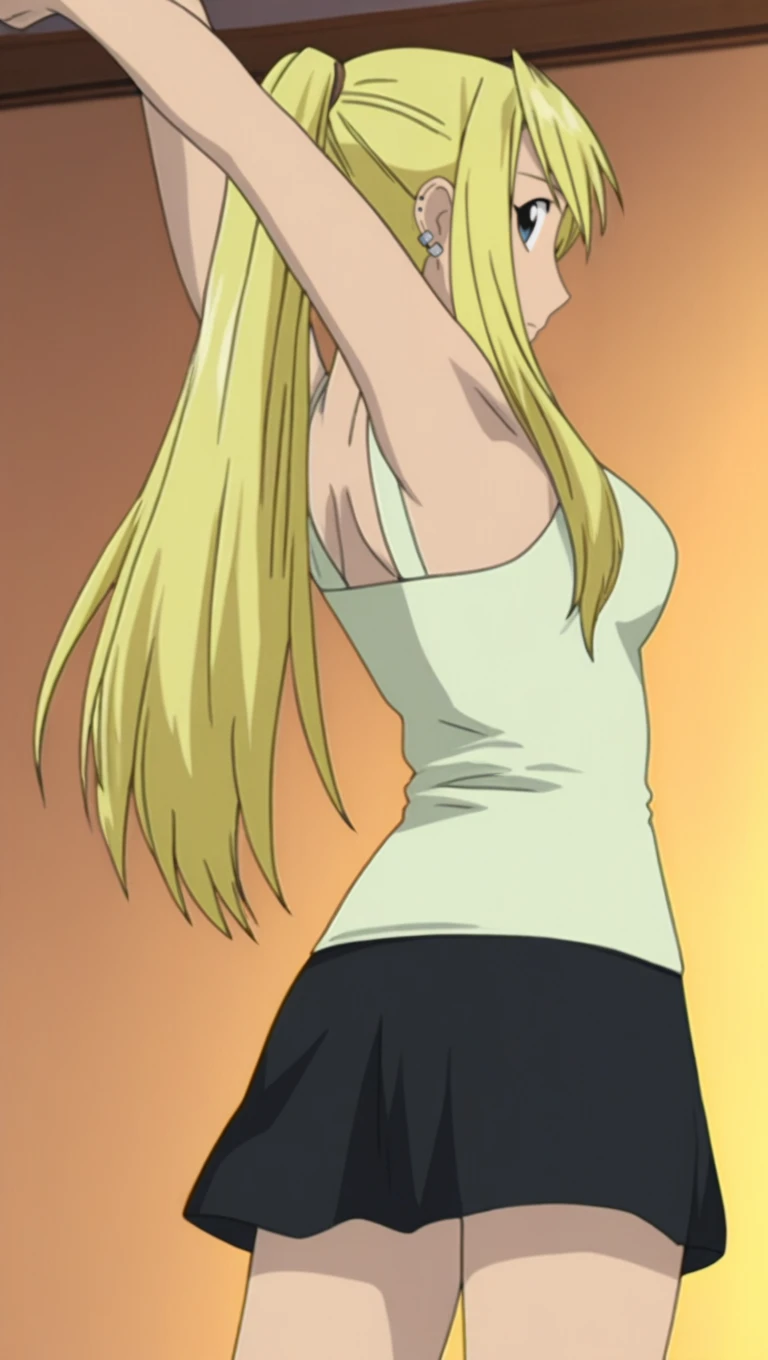 03 c4su4l, alternate ponytail, alternate bangs, light green tank top, black miniskirt, brown ankle boots, white socks, alternate silver ear piercing, 03 style, medium breasts,