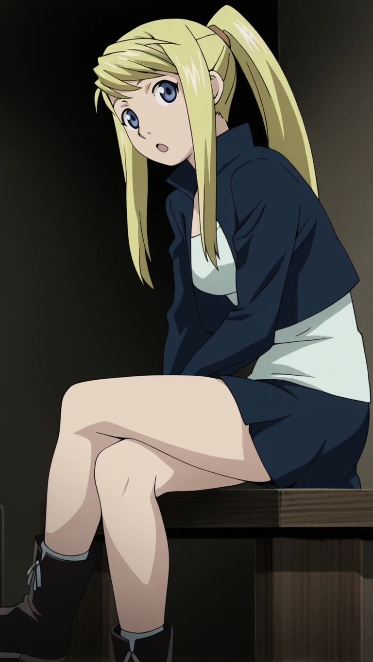 09 c4su41, blue eyes, ponytail, bangs, light blue tank top, dark blue miniskirt, dark brown ankle boots, silver ear piercing, 09 style, medium breasts,