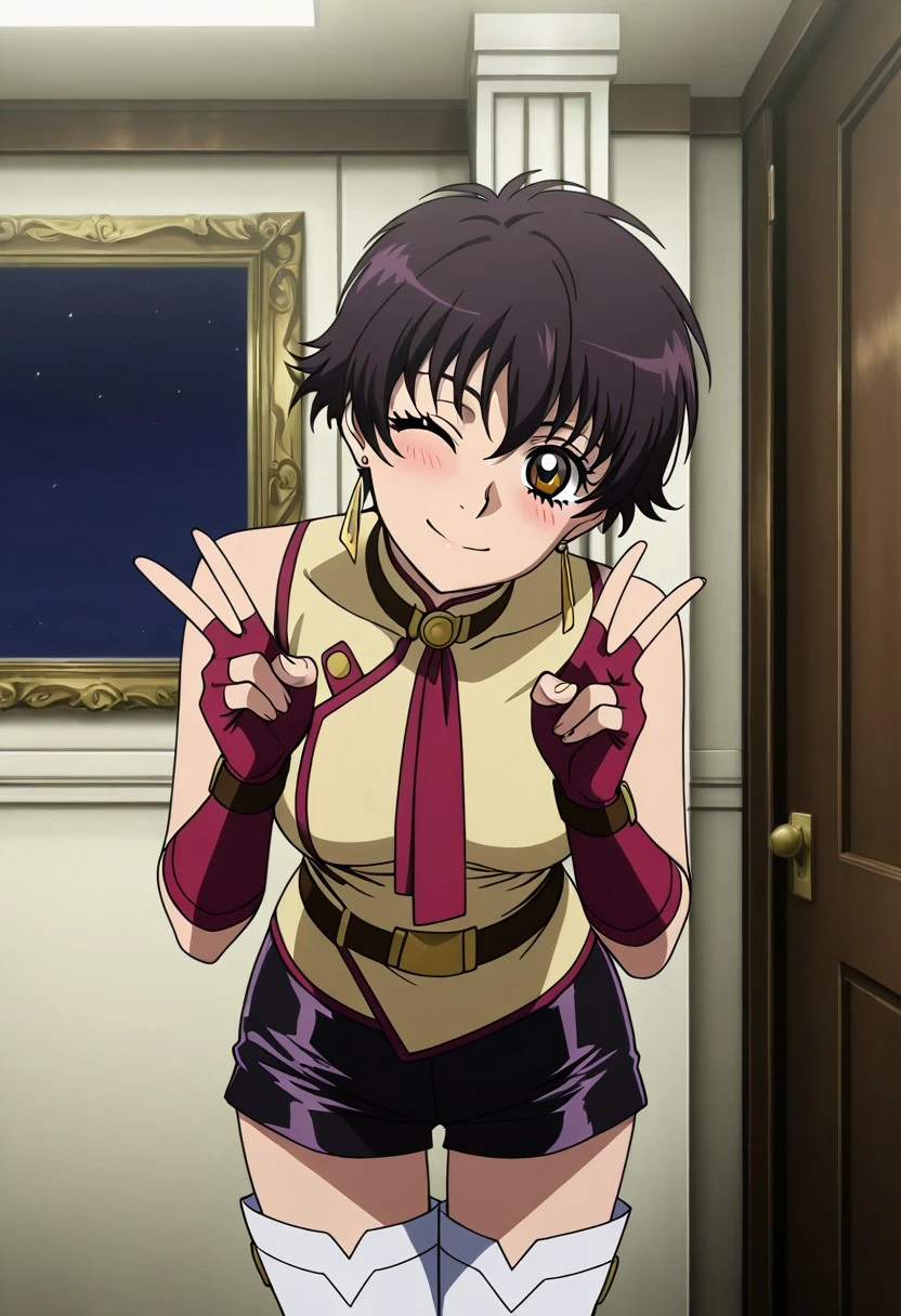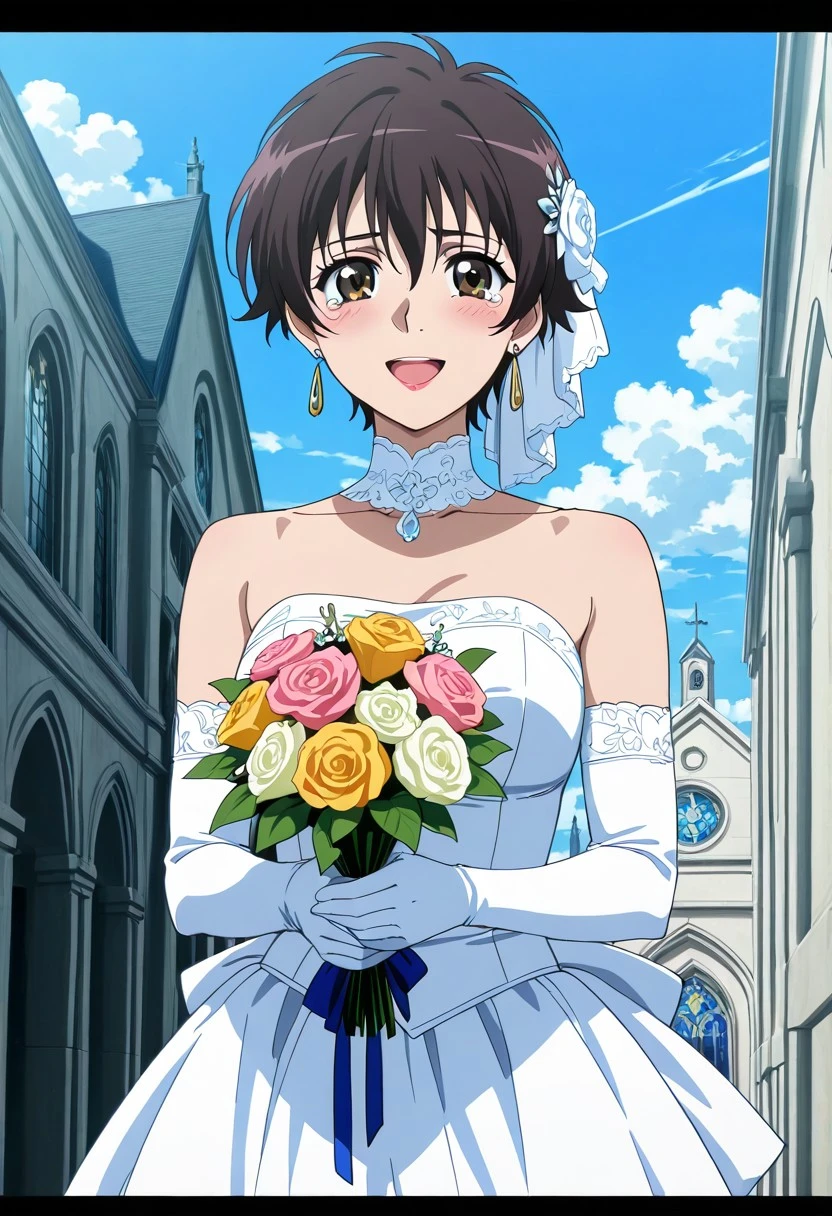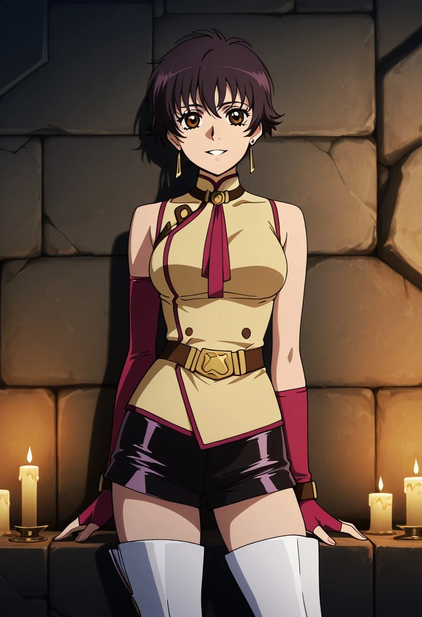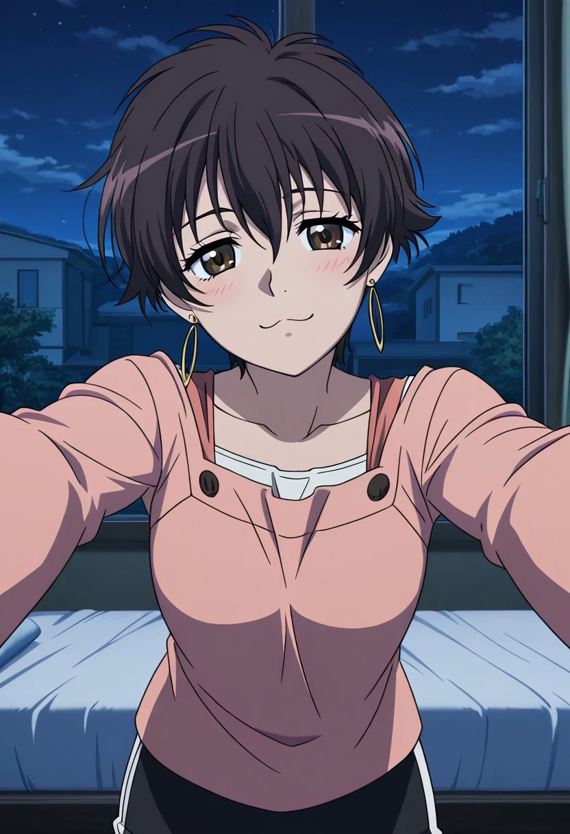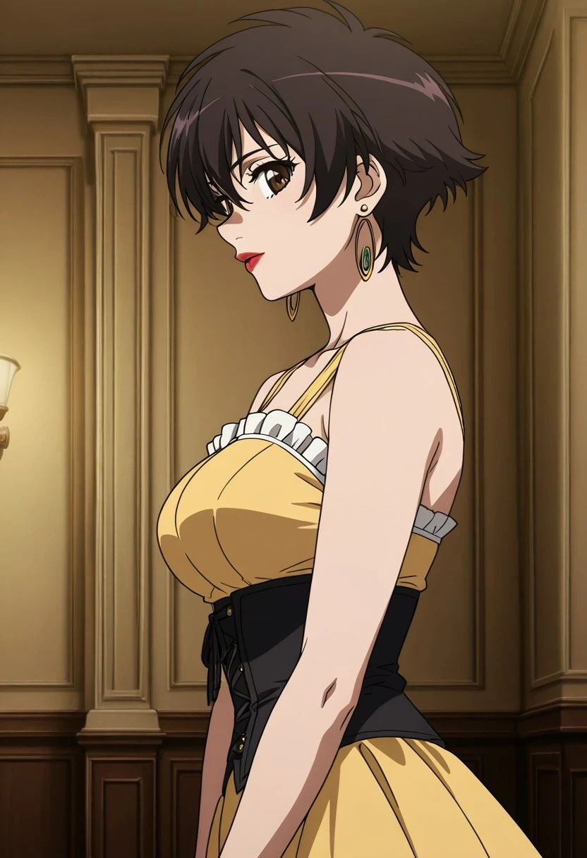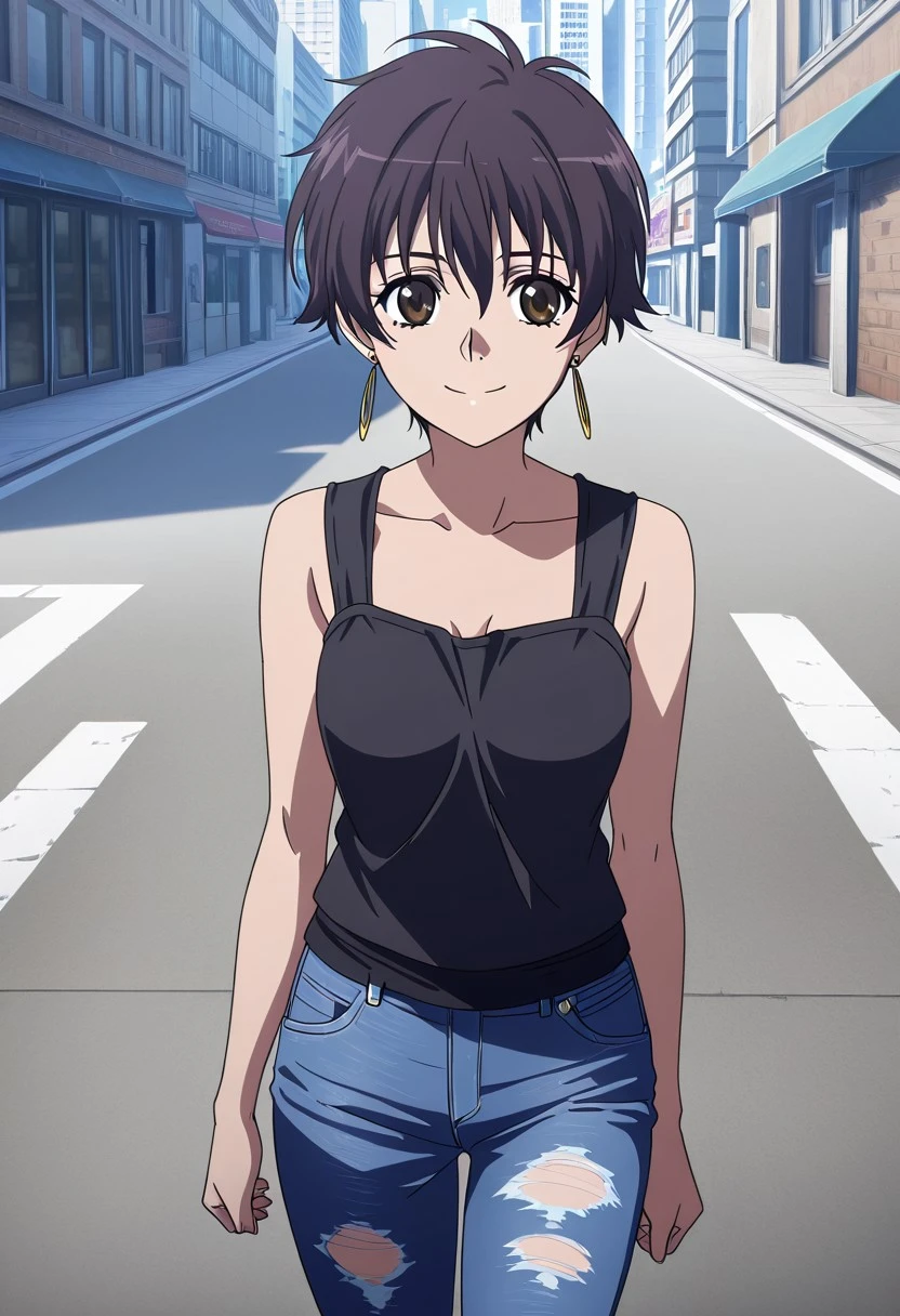 Character: 1girl, solo, Tiz, dark brown hair, short hair, brown eyes, earrings,