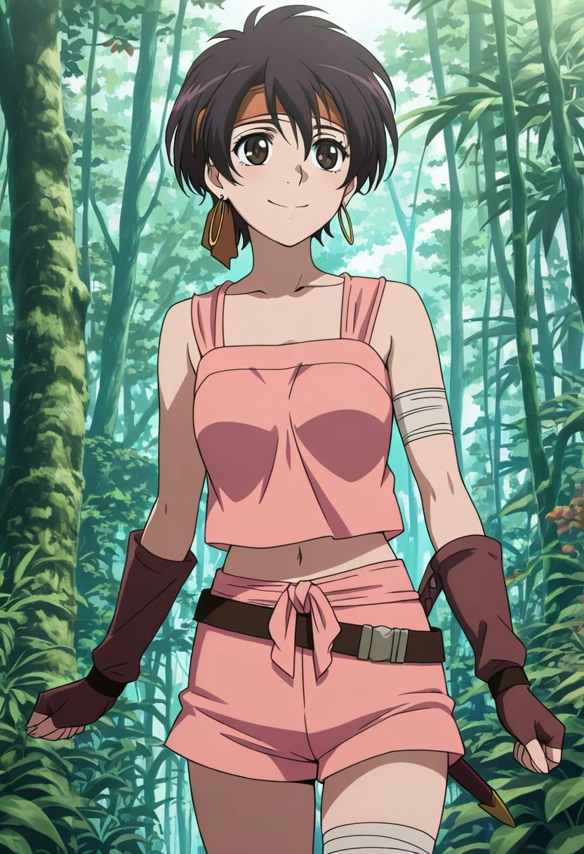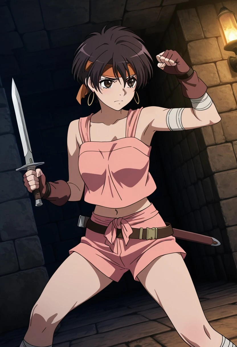 1girl, solo, Tiz, dark brown hair, short hair, brown eyes, earrings, brown gloves, fingerless gloves, pink shorts, belt, pink shirt, navel, mildriff, sheveless, bandaged legs, brown shoes, orange headband