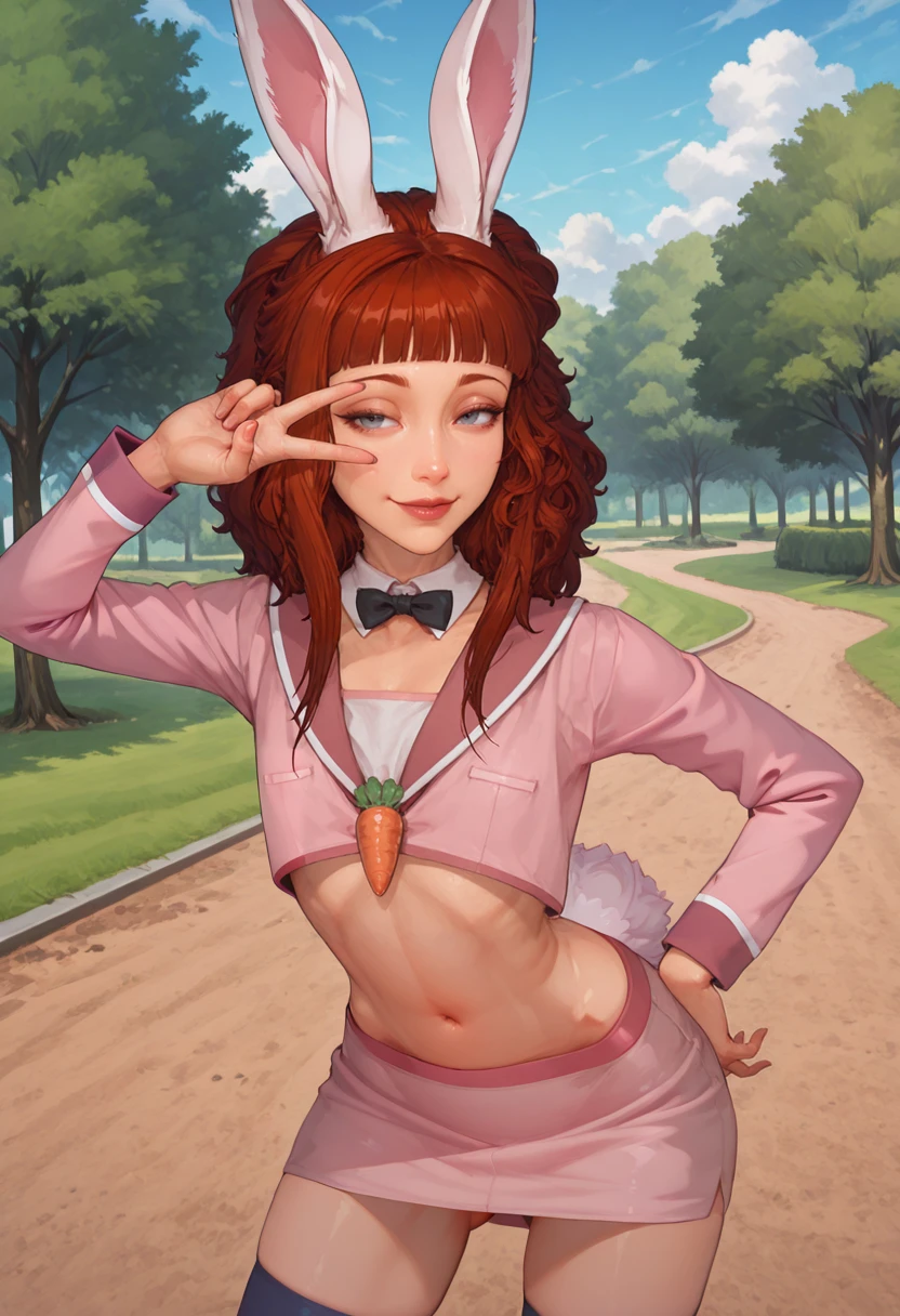 pink blazer, cropped jacket, white crop top, pink miniskirt, white detached collar, black bowtie, pink chokerfake animal ears, white rabbit ears, fake tail, purple rabbit tail, carrot brooch, food-themed broochDescription