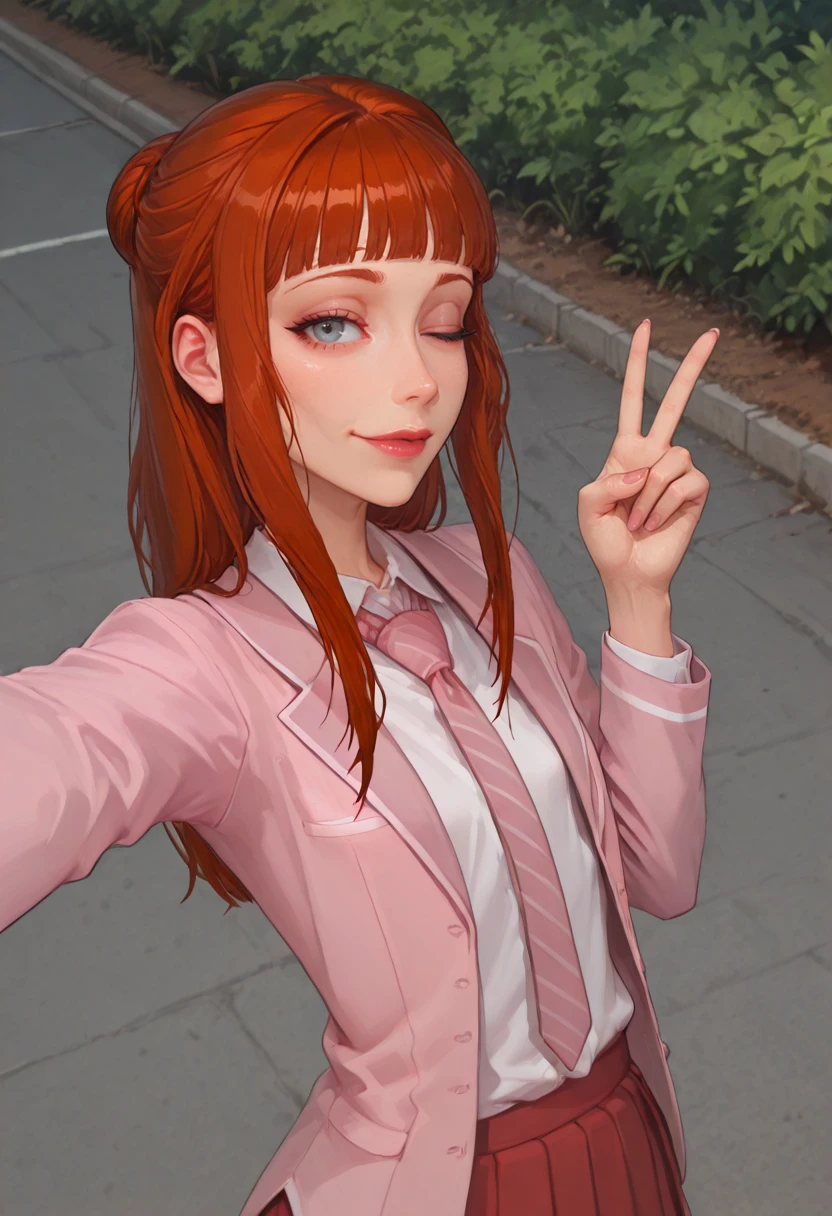 pink blazer, white collared shirt, red pleated skirt, pink necktie, striped necktie, (optional) dark blue thighhighs, brown loafers