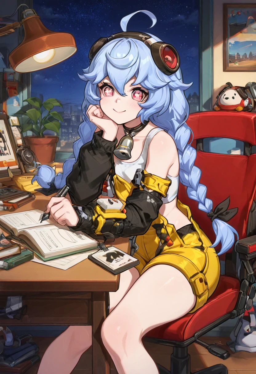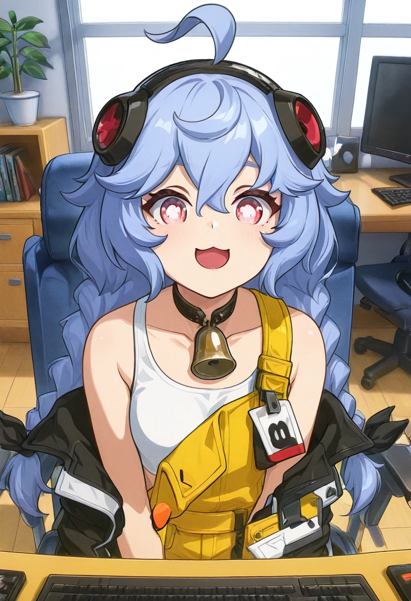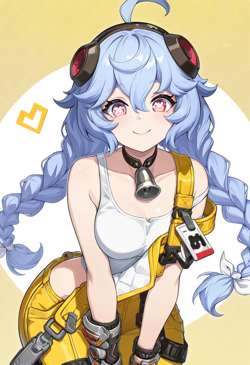 zzMechanika, red eyes, blue hair, ahoge, twin braids, long hair, bangs, hair between eyes, hair ornament, symbol-shaped pupils, neck bell, white tank top, bare shoulders, yellow overalls, off shoulder, collarbone,