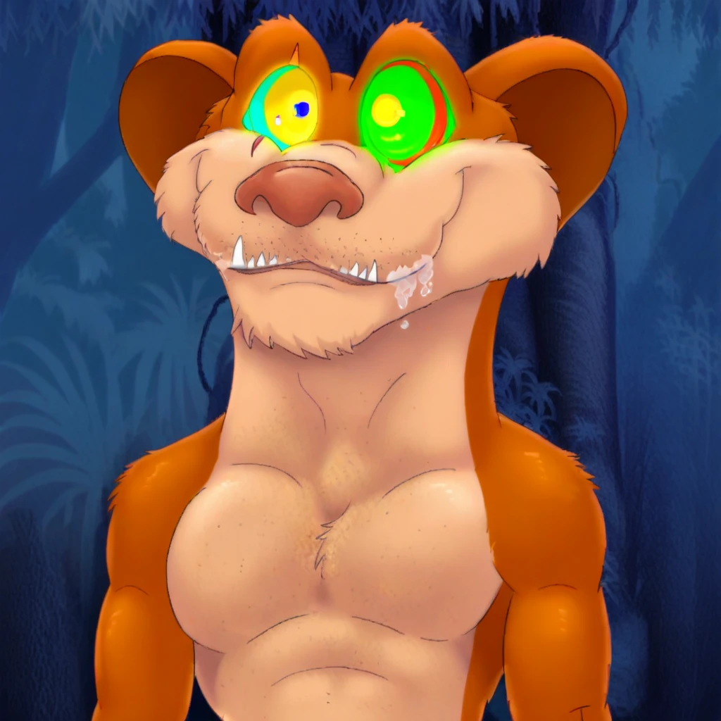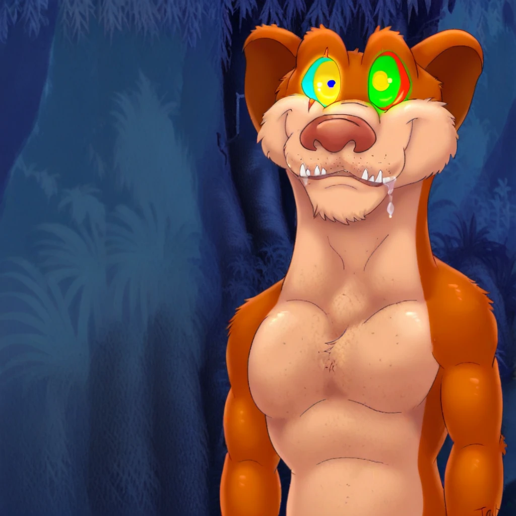 buckminster,crooked jaw, ice age, furry, hypnotized eyes, goofy smile, drooling, night jungle, identical style art, no-human, solo, kaa eyes,