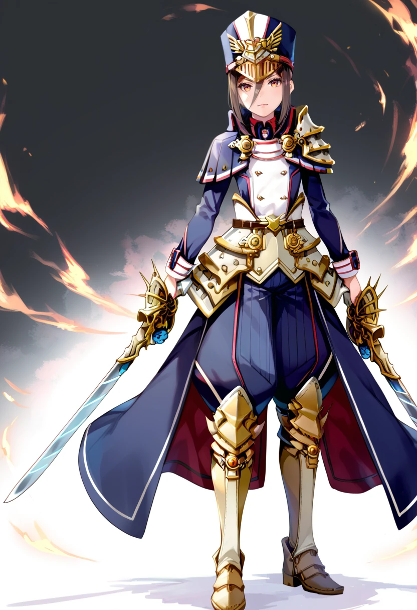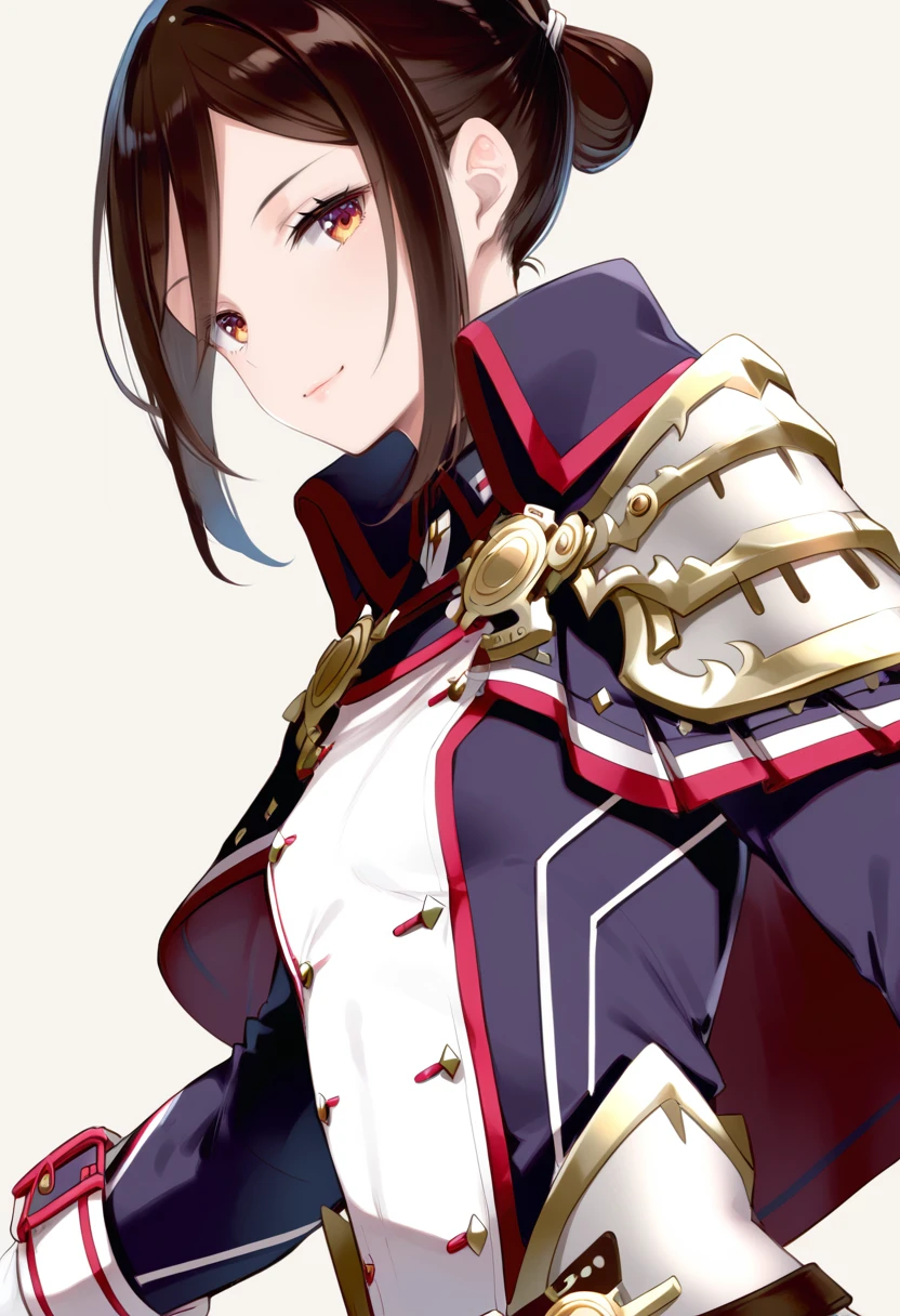 Tags (clothes, normal): blue military uniform, pauldrons, blue military hat {or} single hair bun, white gloves,