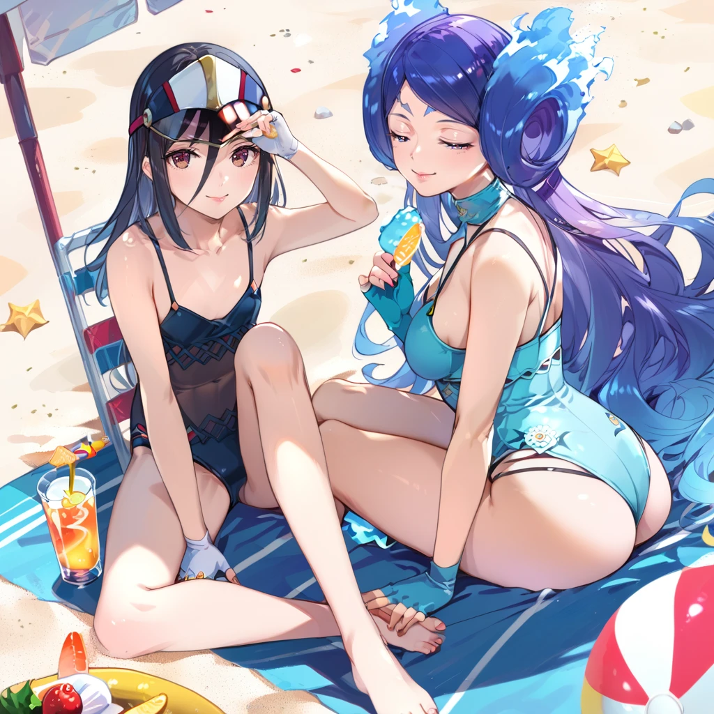 Tags (clothes, swimsuit): visor cap, casual one-piece swimsuit, white fingerless gloves, sandals