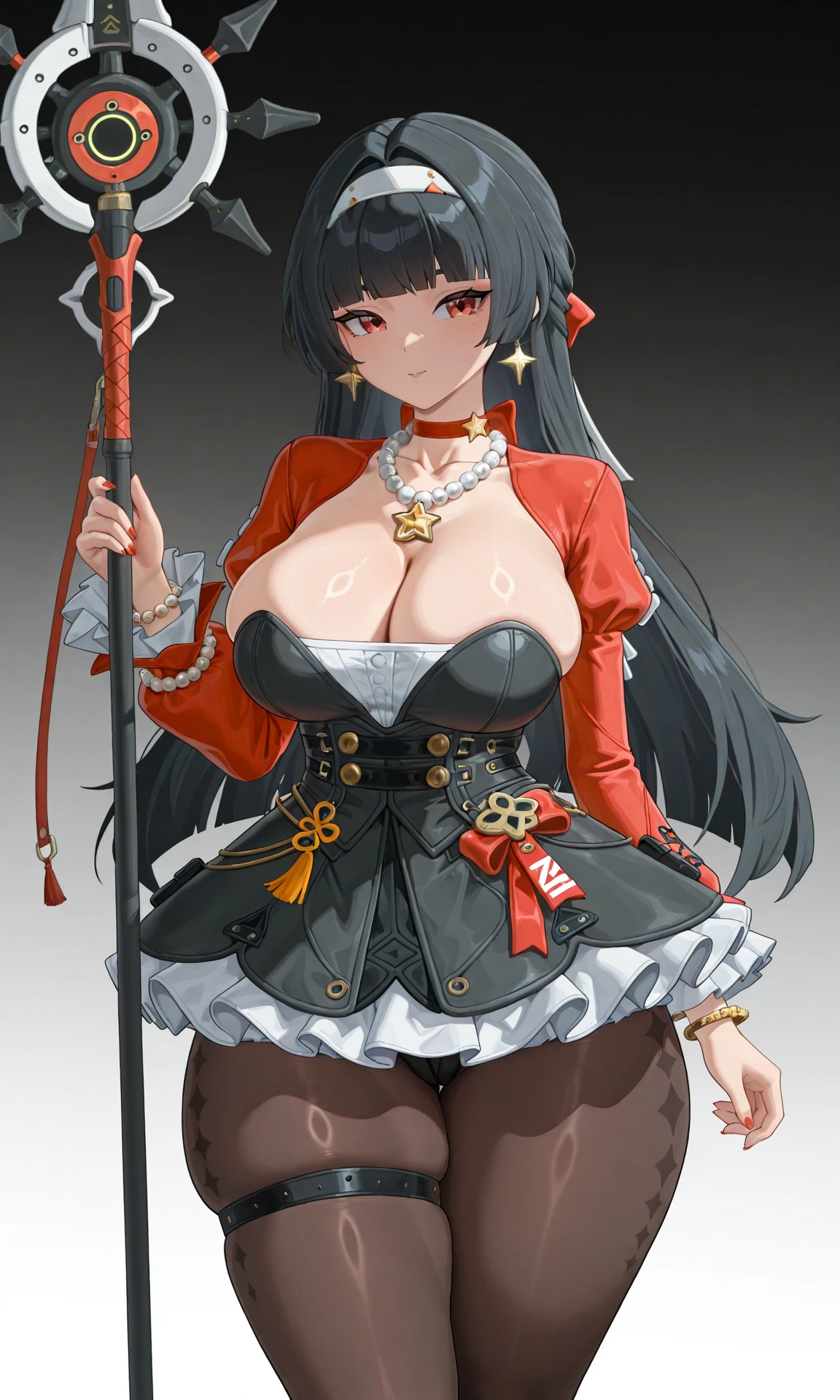 red eyes, black hair, long hair, blunt bangs, white hairband, jewelry, earrings, red bow choker, bead necklace, pendant, cleavage, frilled sleeves, long sleeves, minidress, star ornament, bracelet, thigh strap, staff