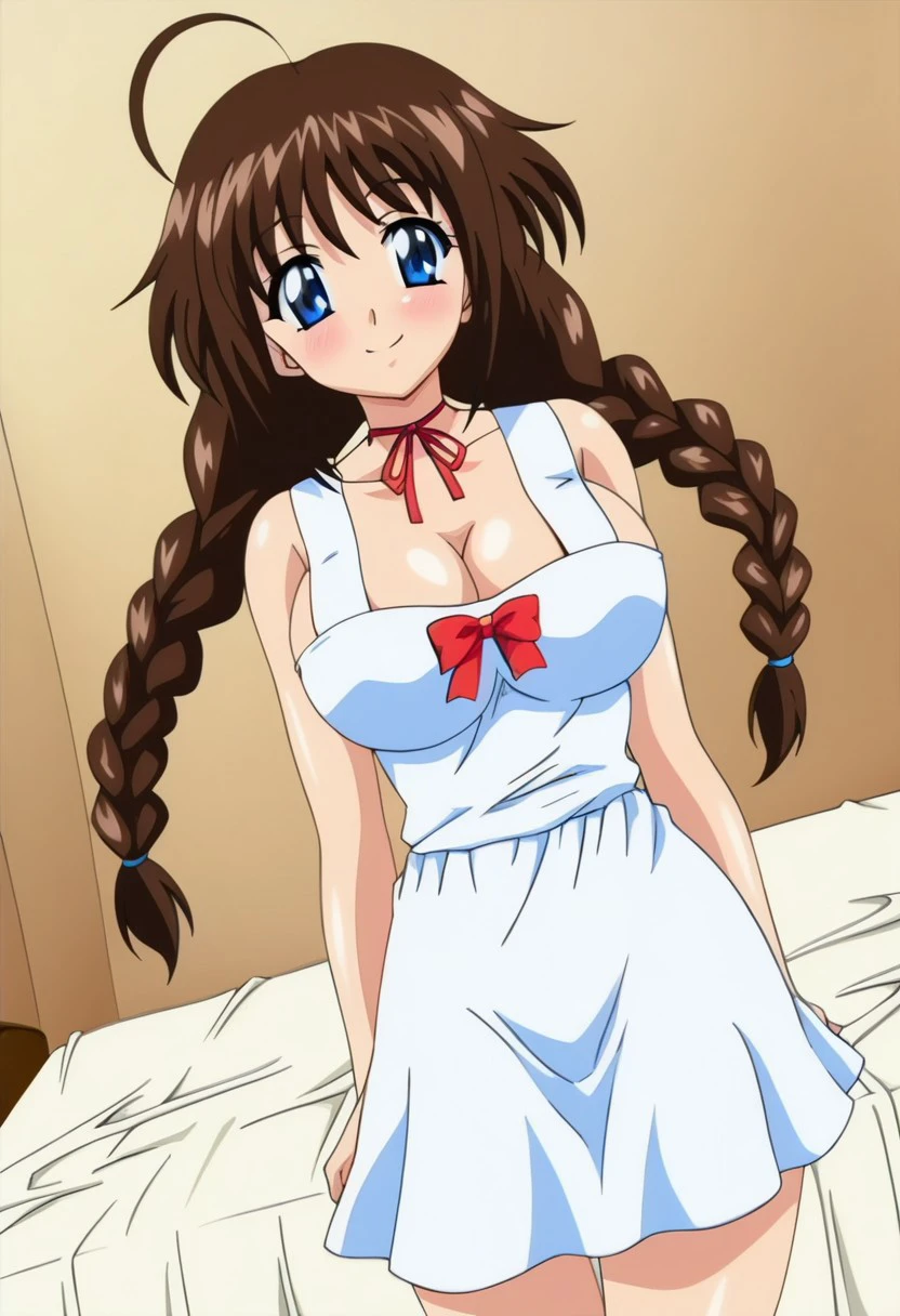 haruka takai issho ni h shiyo ep2 anime, brown hair, long hair, low twin braids, ahoge, blue eyes, large breasts,