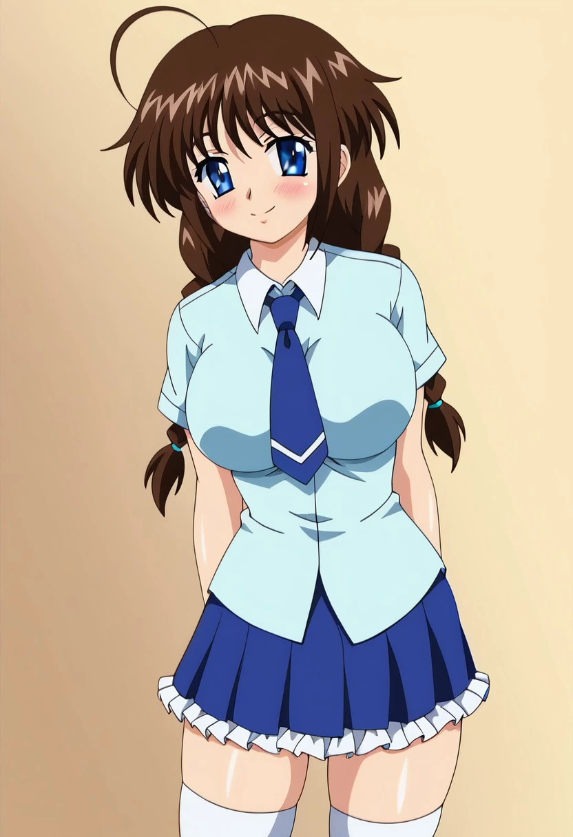 haruka takai's school outfit, dress shirt, aqua shirt, collared shirt, blue necktie, frilled skirt, blue skirt, white thighhighs,