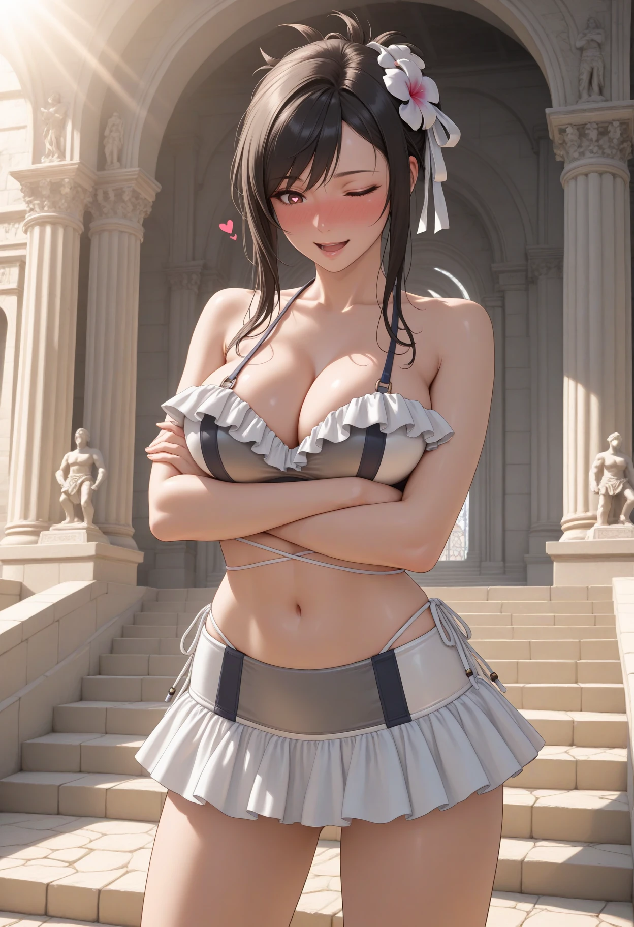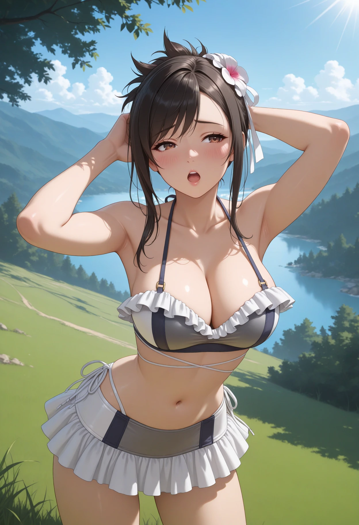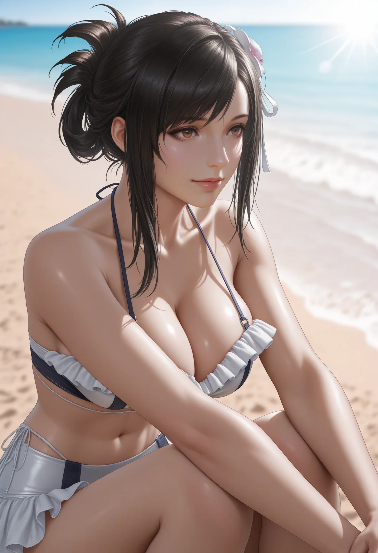 shinspirtflckhrt, brown eyes, black hair, swept bangs, long hair, hair up, hair ornament, white ribbon, swimsuit, frilled bikini, navel, collarbone, bare shoulders, frills, cleavage, stomach, bikini skirt,