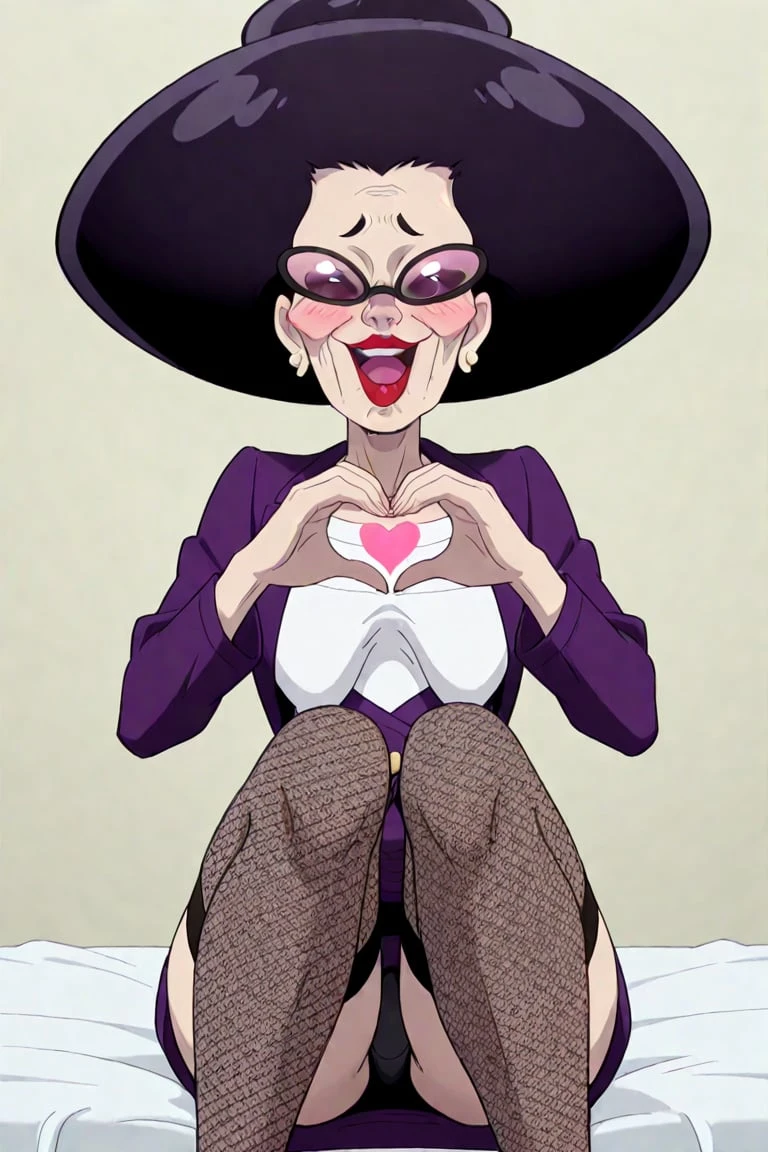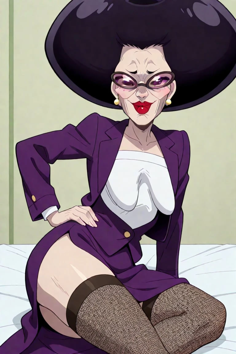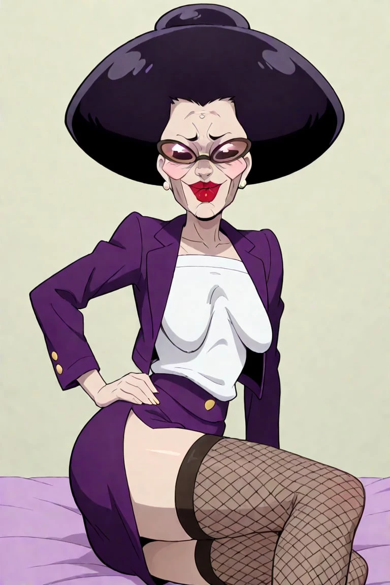 Old lady, pale skin, lanky, middle-age-looking, wrinkly skin, wrinkles, thin eyebrows, tall, curvy, voluptuous large saggy breasted lady, large black afro shaped hair, sunglasses, gold stud earrings, big red lips, purple open blazer jacket, white top shirt underneath, purple skirt, fishnet knee-highs, dark heels,
