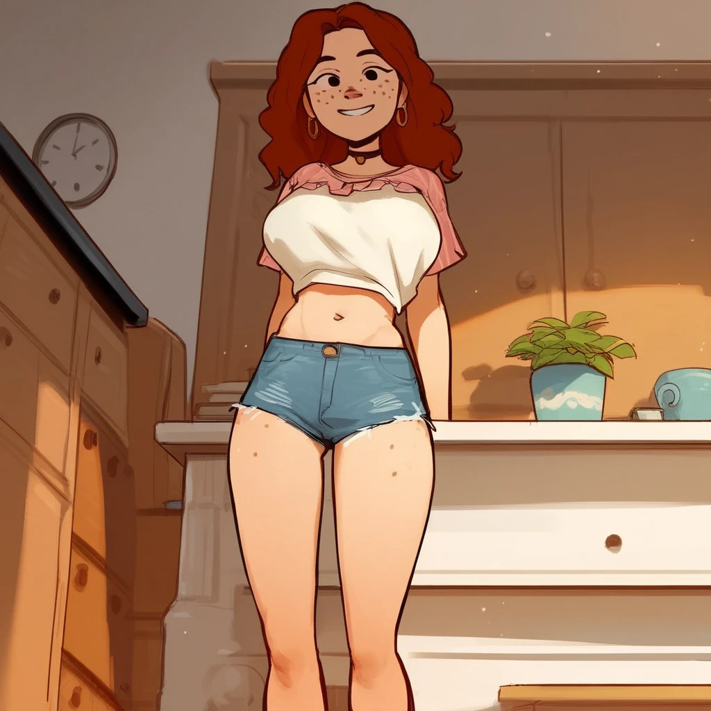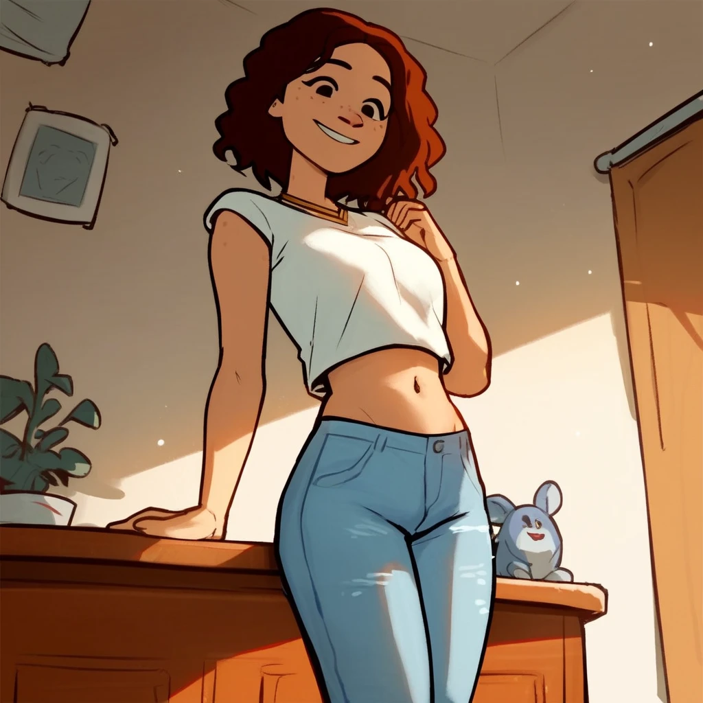 Commission. Suggested weight between 0.85 to 1.0. Produces strong consistent results. It should automatically include freckles without needing to prompted, but these are soft and limited to her face. For stronger freckles, include the keyword. If you want more freckles on the body, try keyword 'body freckles'.