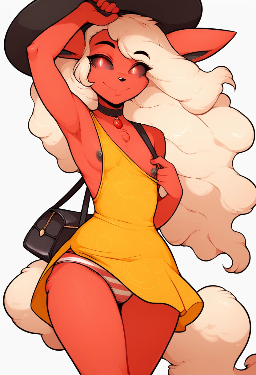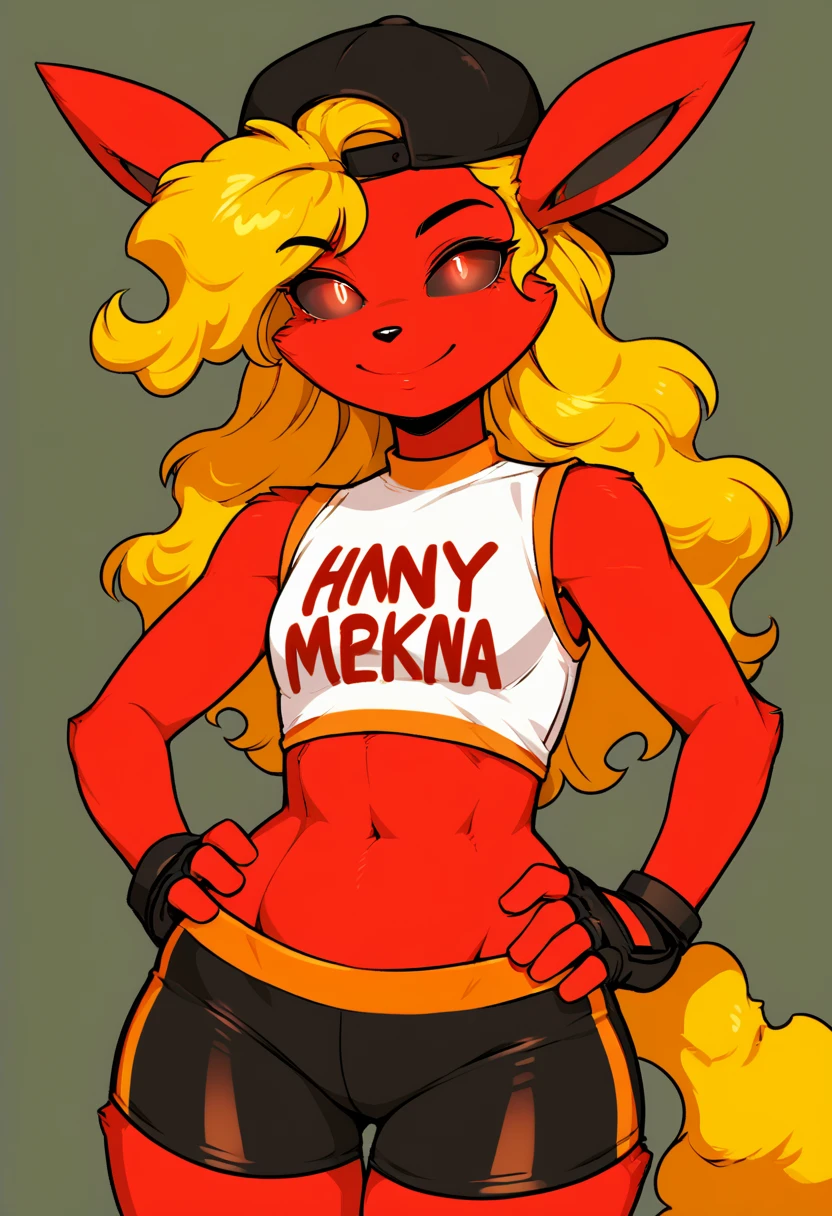 1girl, Sinni, blonde hair, yellow hair, fiery hair, curly hair, black sclera, red eyes, animal ears, fox ears, fire tail, fox tail, red fur, fur, black lips, black pussy, black nipples, furry female, pokemon (creature), flareon, huge ass, wide hips, small breasts