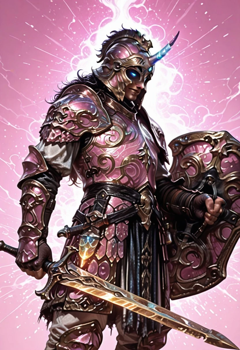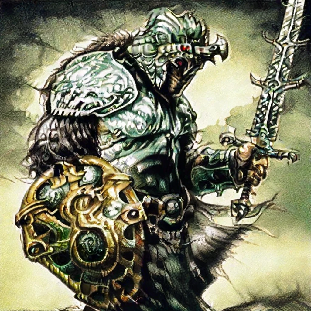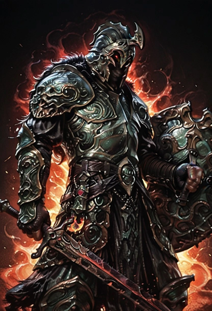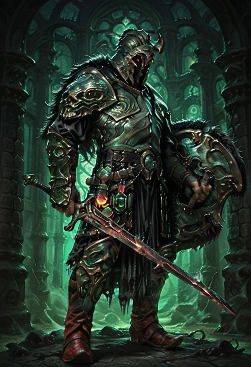 dark-green armor, gold trim, helmet, chestplate, gauntlets, greaves, fingerless gloves, black clothes, red boots, black sword, dark-green shield, black fur-trimmed shield,