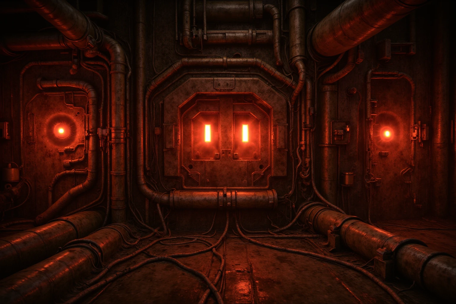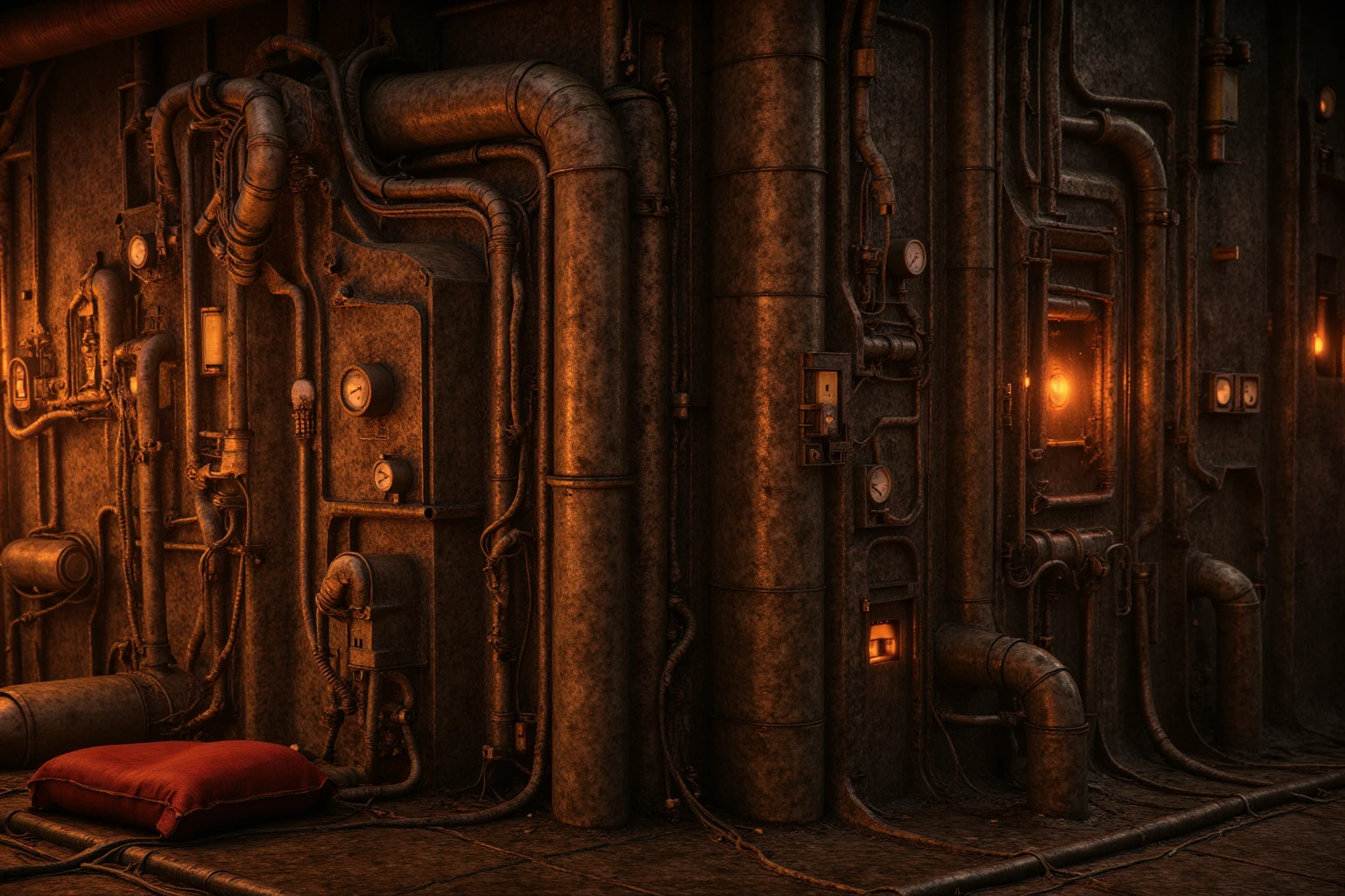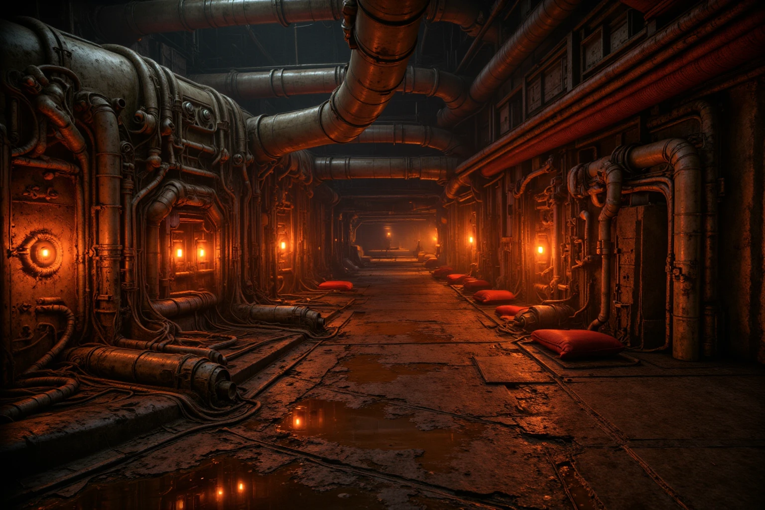 Underground Facility, a vast industrial facility below ground, filled with heavy pipes, ducts, and dense mechanical infrastructure along both walls and ceiling. On the right side of the facility, modular vertical pipes are visible. On the left side of the facility, large cylindrical reactor unit emits intense orange light, casting warm reflections across wet, damaged metal flooring with puddles and debris. Thick ventilation tubes and conduits form a complex overhead network. The environment shows heavy wear with rust, grime, and moisture on surfaces. Dim ambient shadows contrast with localized glowing elements, emphasizing depth and a long perspective leading further into the facility. The scene feels abandoned yet operational, with active heat sources illuminating the gritty, enclosed space.