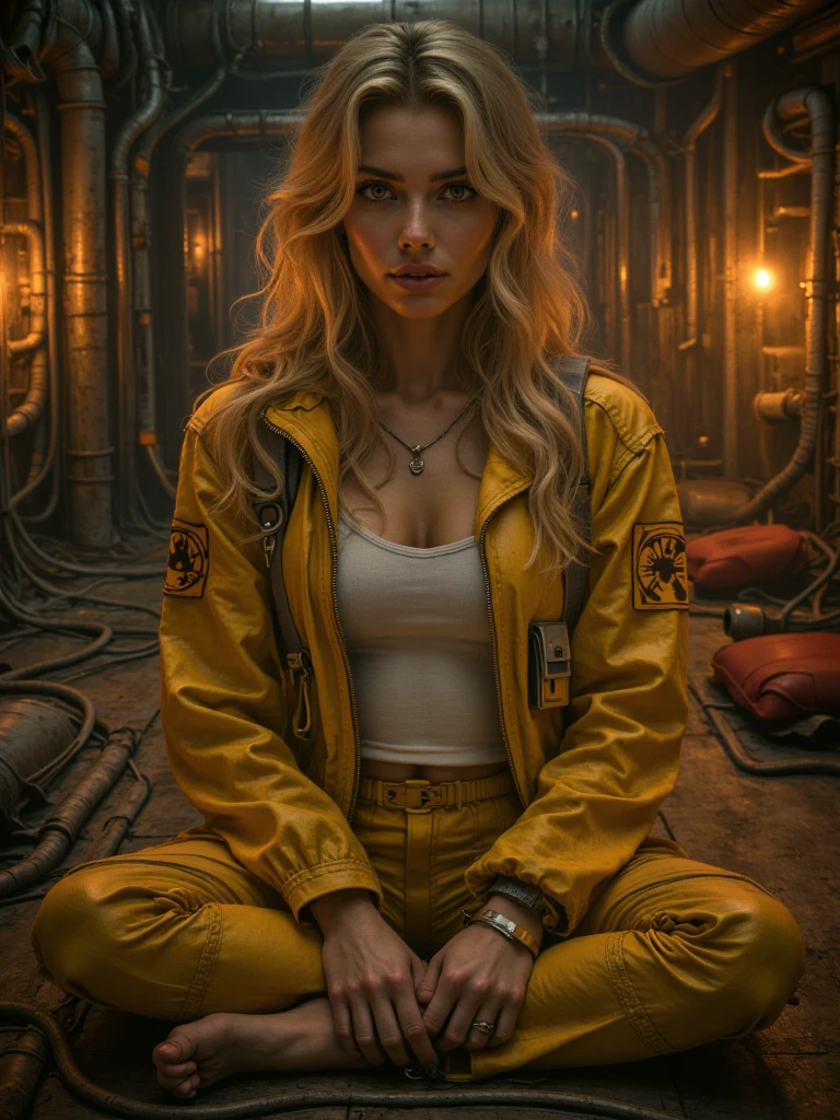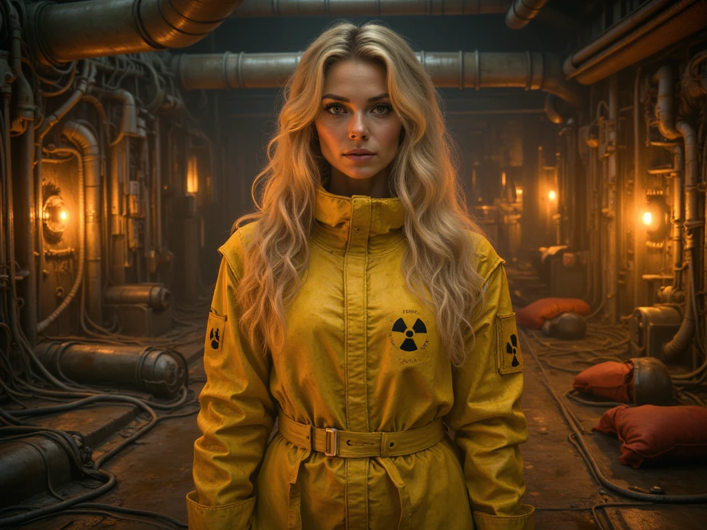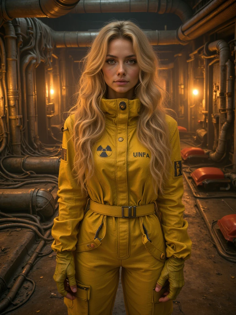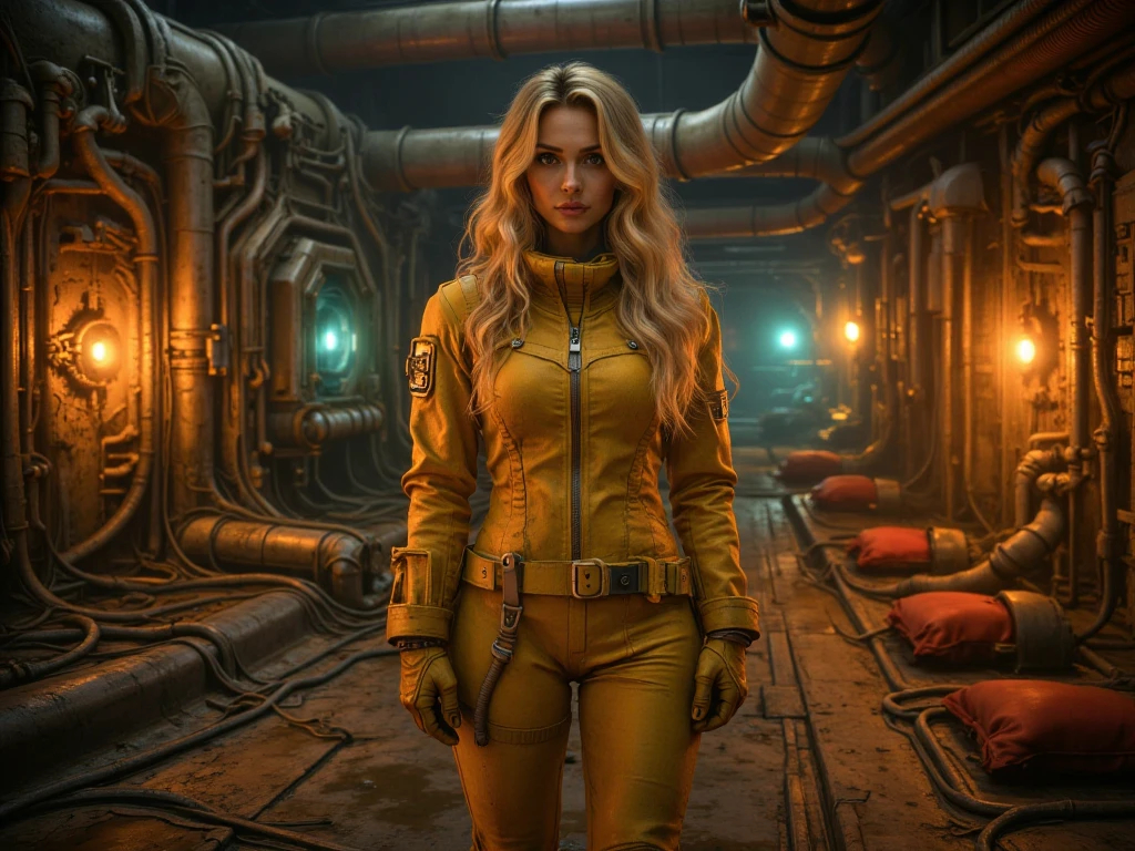 Underground Facility, a vast industrial facility below ground, filled with heavy pipes, ducts, and dense mechanical infrastructure along both walls and ceiling. On the right side of the facility, modular vertical pipes are visible. On the left side of the facility, large cylindrical reactor unit emits intense orange light, casting warm reflections across wet, damaged metal flooring with puddles and debris. Thick ventilation tubes and conduits form a complex overhead network. The environment shows heavy wear with rust, grime, and moisture on surfaces. Dim ambient shadows contrast with localized glowing elements, emphasizing depth and a long perspective leading further into the facility. The scene feels abandoned yet operational, with active heat sources illuminating the gritty, enclosed space.