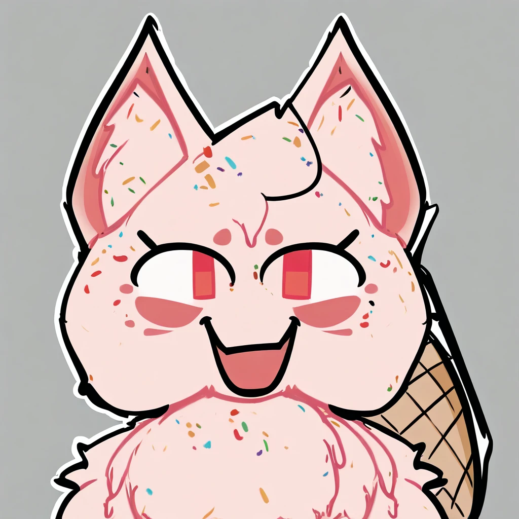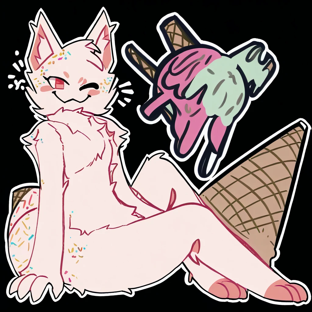 feline, furry, anthro, pink fur, pink skin, ice cream, animal ears, cat ears, fluffy, sprinkles, red sprinkles, yellow sprinkles, blue sprinkles, rainbow sprinkles, red eyes, ice cream creature, tail, large tail, ice cream tail, ice cream cone tail, ice cream cone, :3