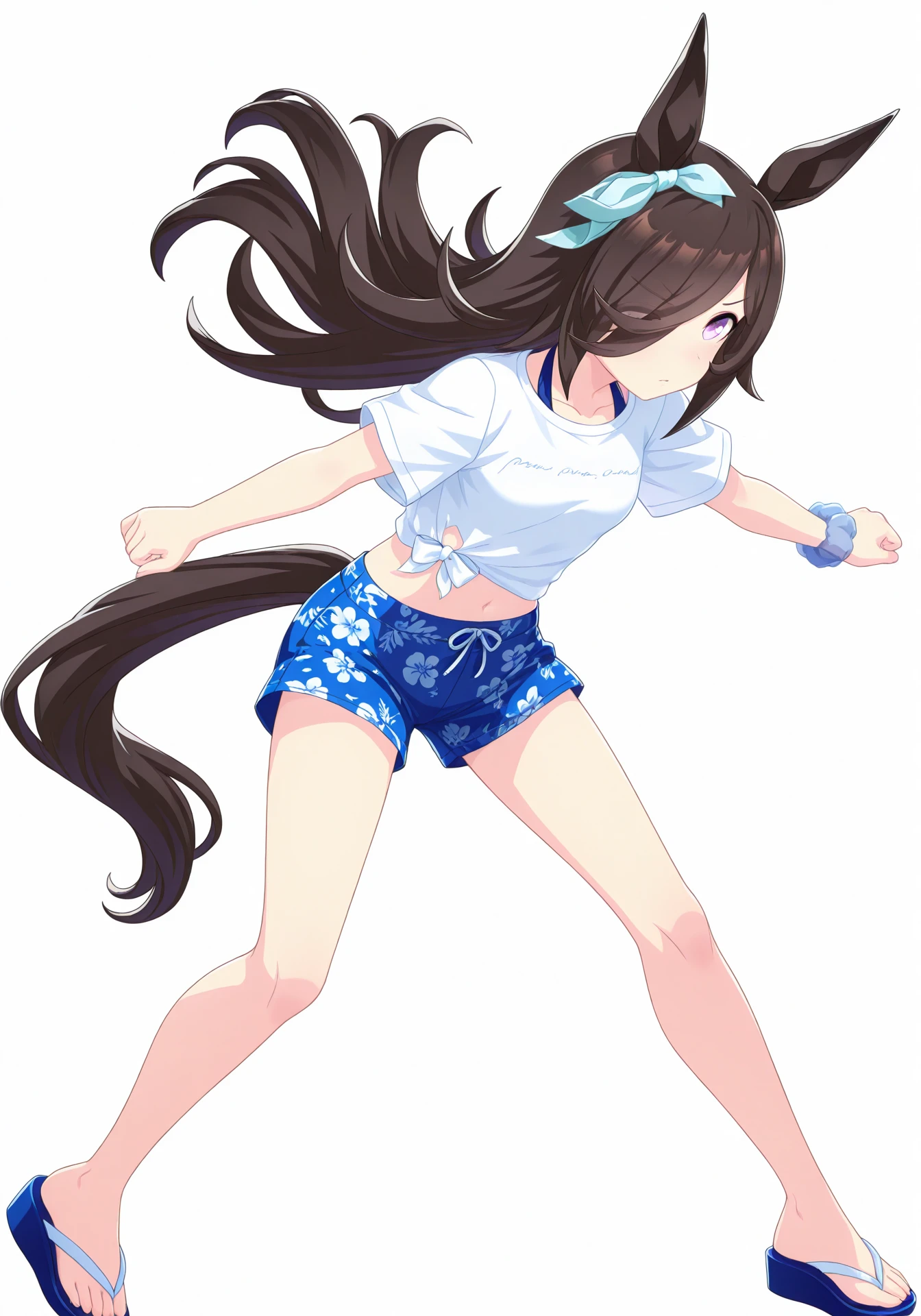 gazeblue, white tied midriff, blue short shorts, blue wrist scrunchie, blue flip-flops, blue bikini, bikini under clothes
