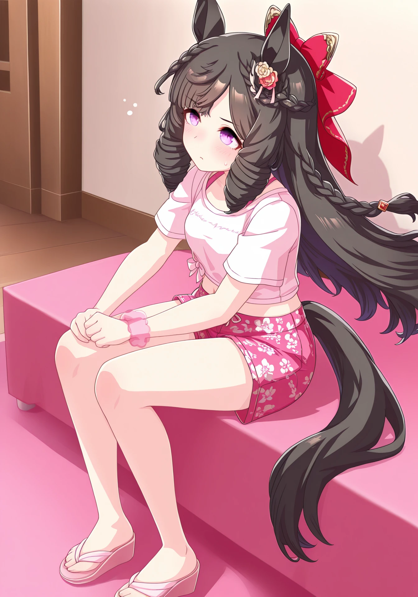 gazepink, white tied midriff, pink short shorts, pink wrist scrunchie, pink flip-flops, pink bikini, bikini under clothes