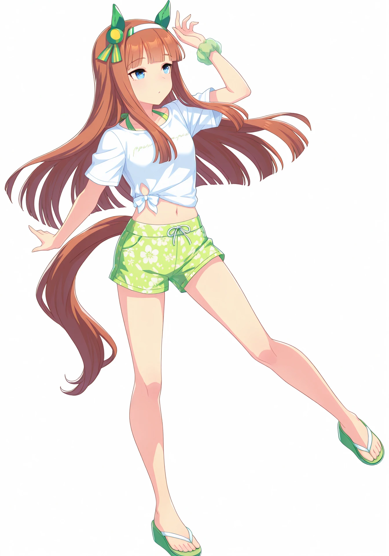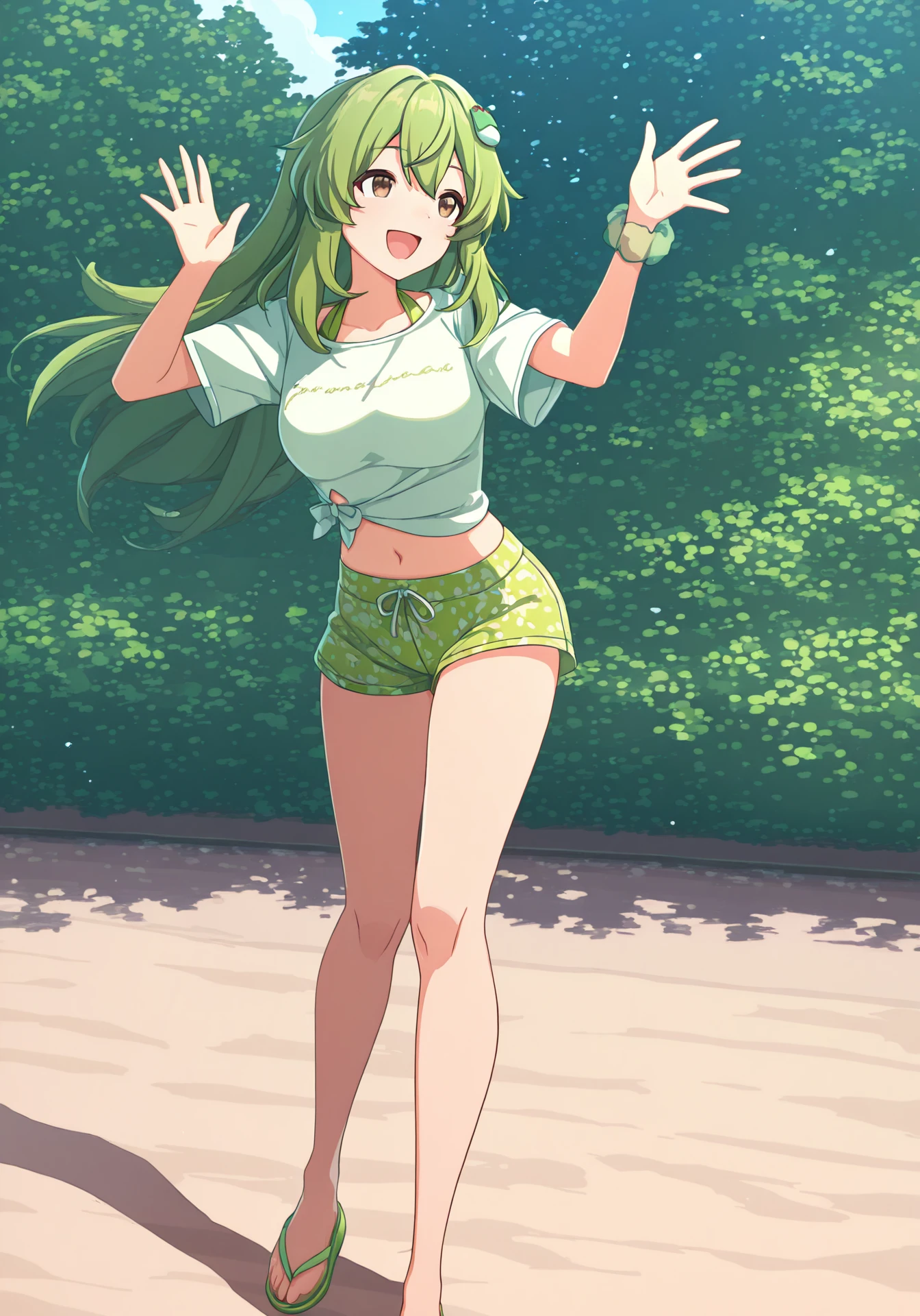 gazegreen, white tied midriff, green short shorts, green wrist scrunchie, green flip-flops, green bikini, bikini under clothes