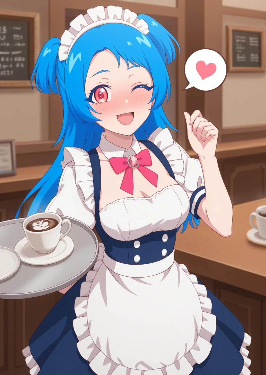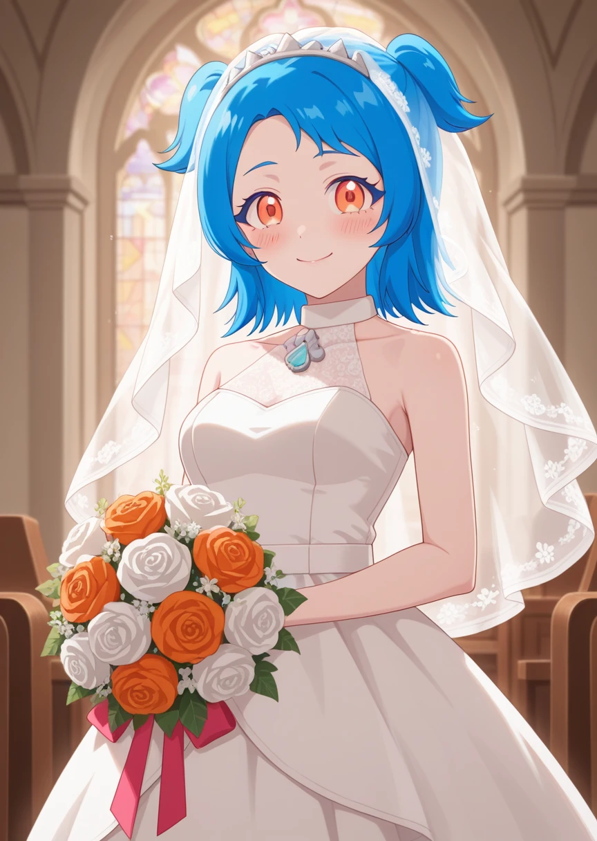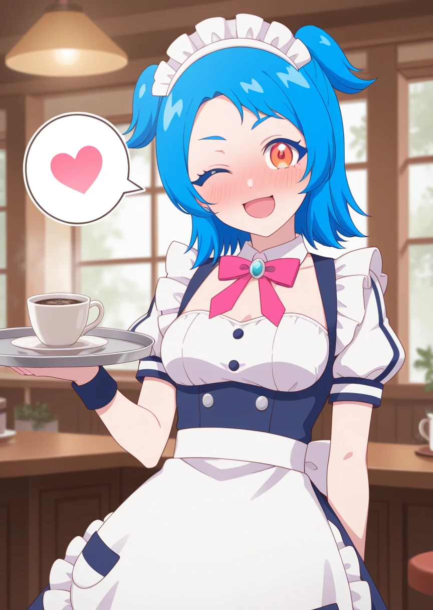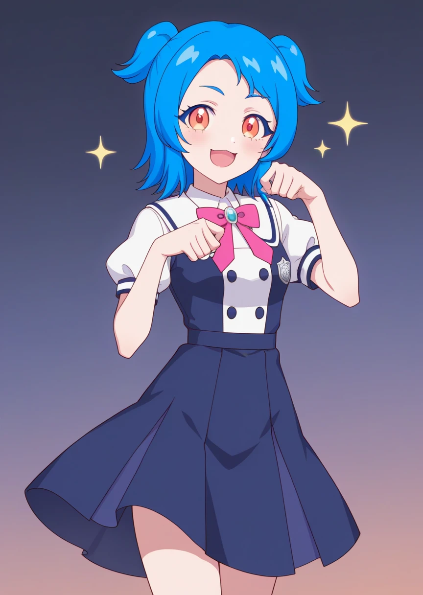 vivipri, blue hair, twintails, short hair, school uniform, dress, blue skirt,orange eyes,