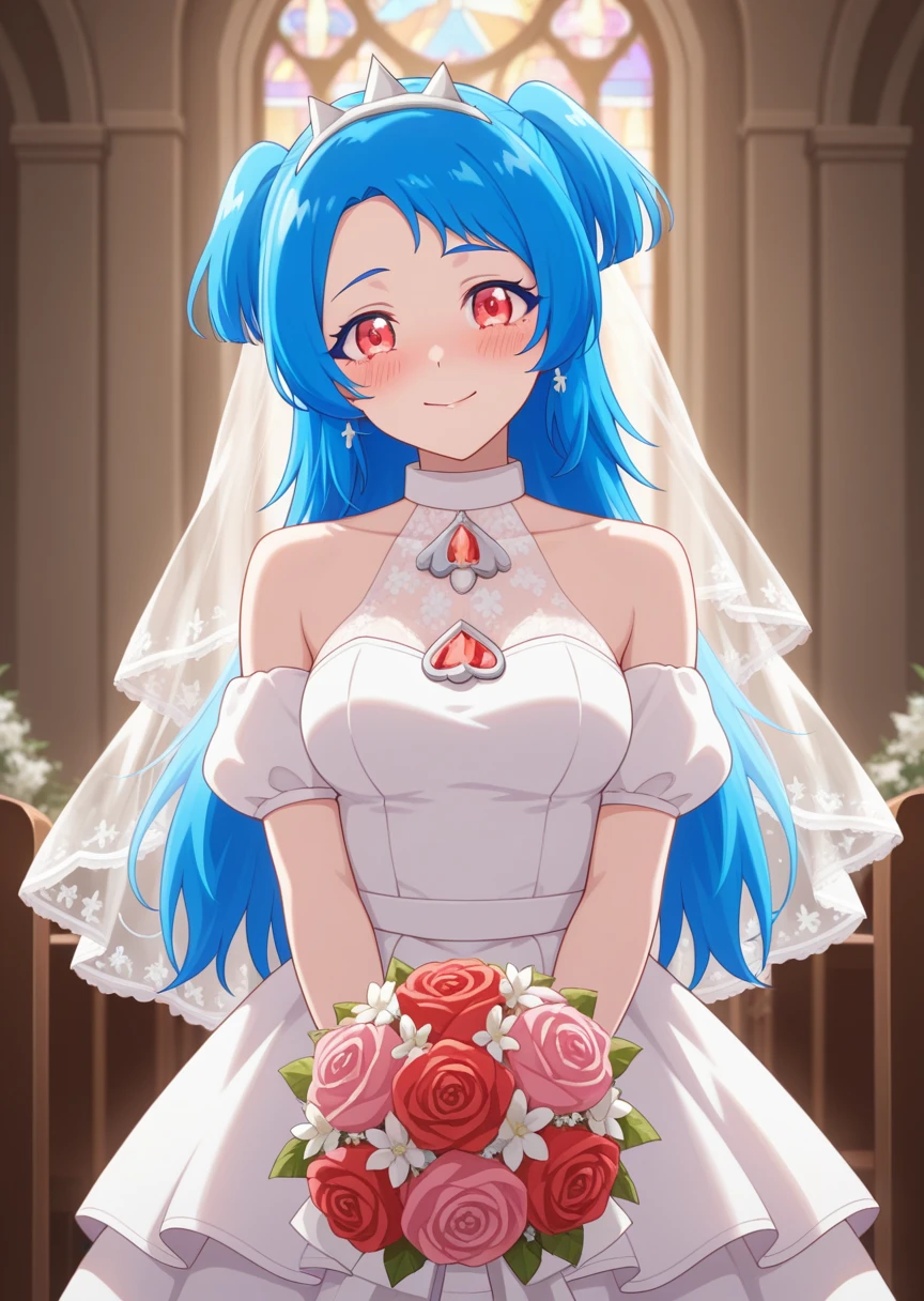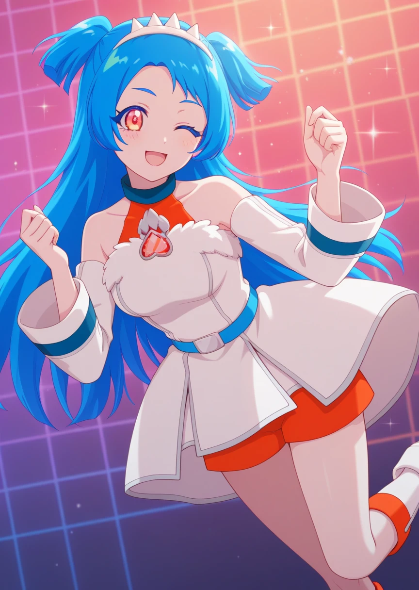 Aipri: viviai, blue hair, twintails, tiara, red eyes, idol clothes, white dress, orange undershirt, orange shorts, boots,
