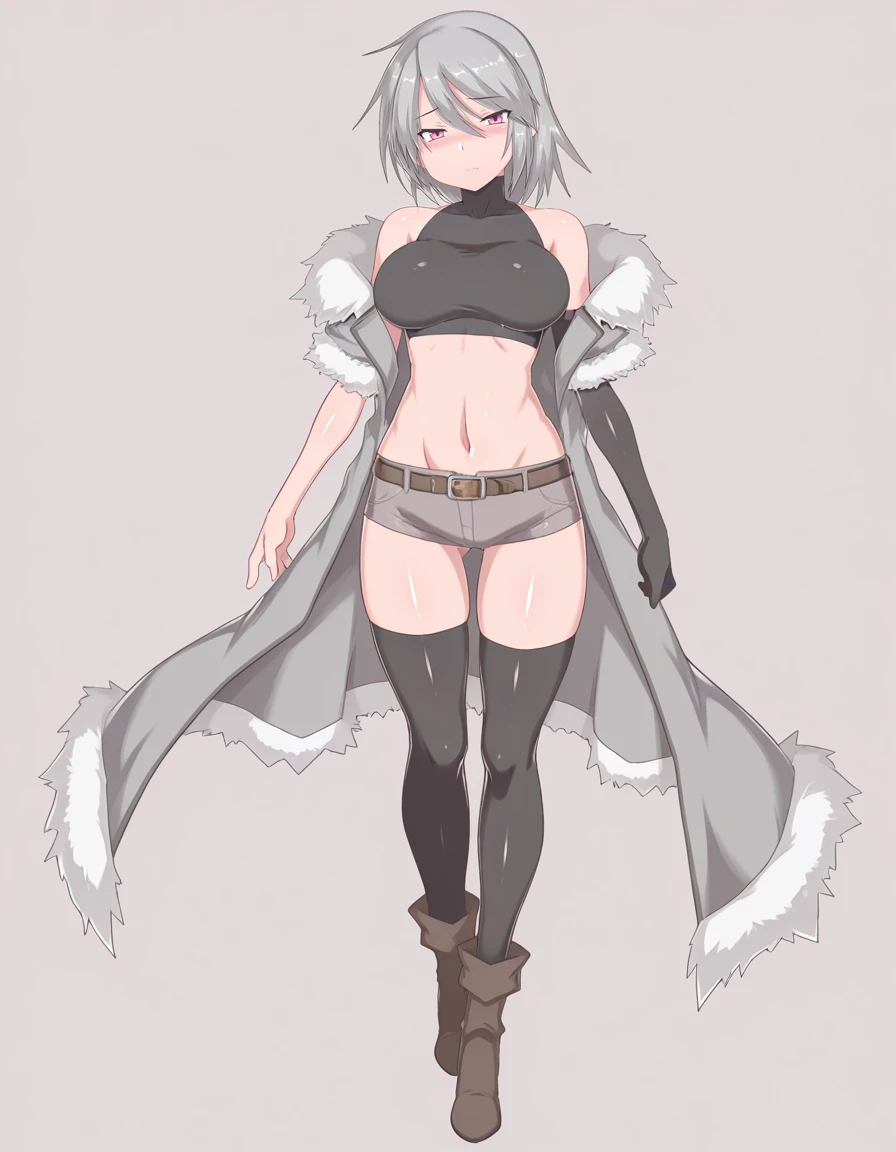 mai_smgrace,short_hair,grey_hair,pink_eyes,large_breasts,sleeveless_turtleneck,midriff,grey_coat,short_sleeves,fur_trim,belt,short_shorts,black_elbow_gloves,single_bare_arm,black_thighhighs,black_boots