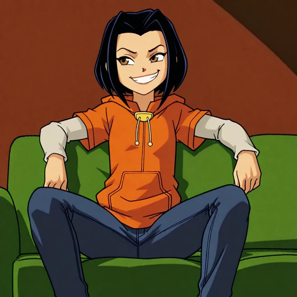 jade_jca, 1girl, black hair, short hair, brown eyes, hoodie, layered sleeves, jeans