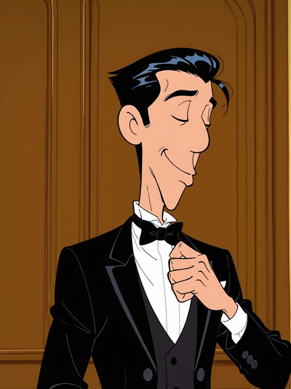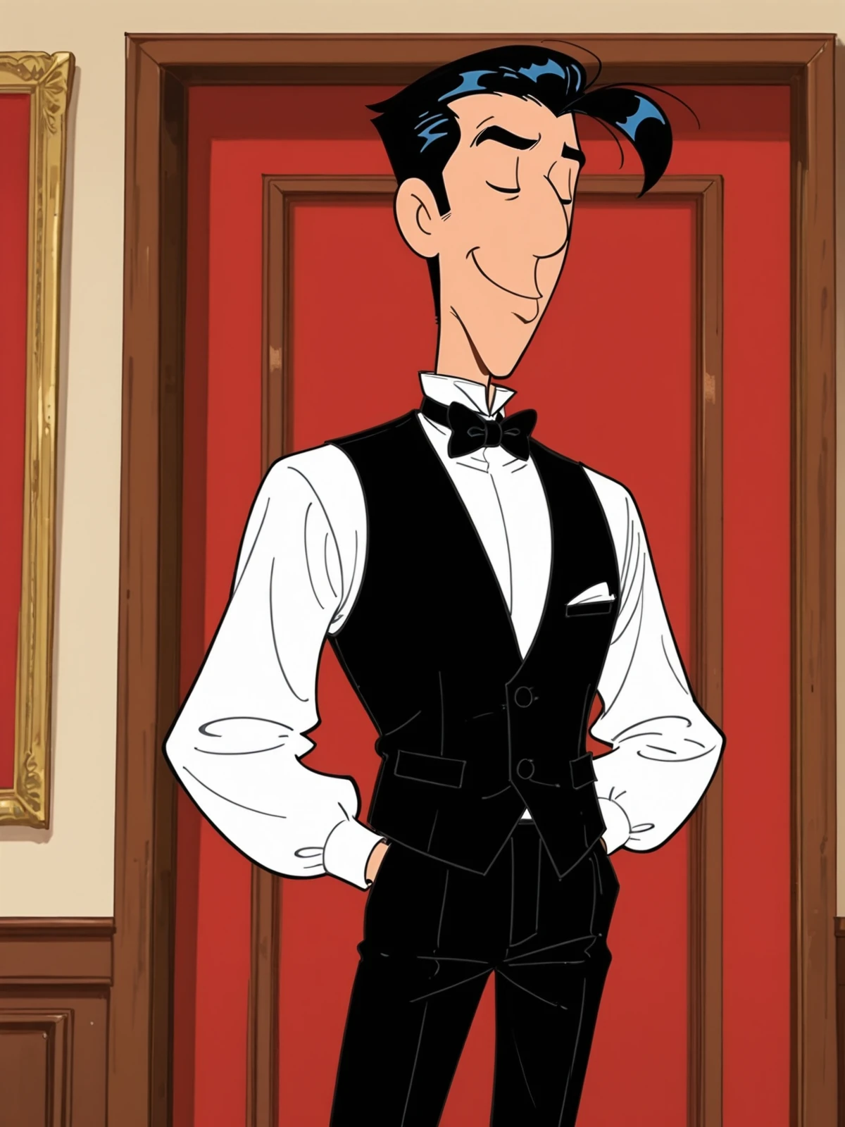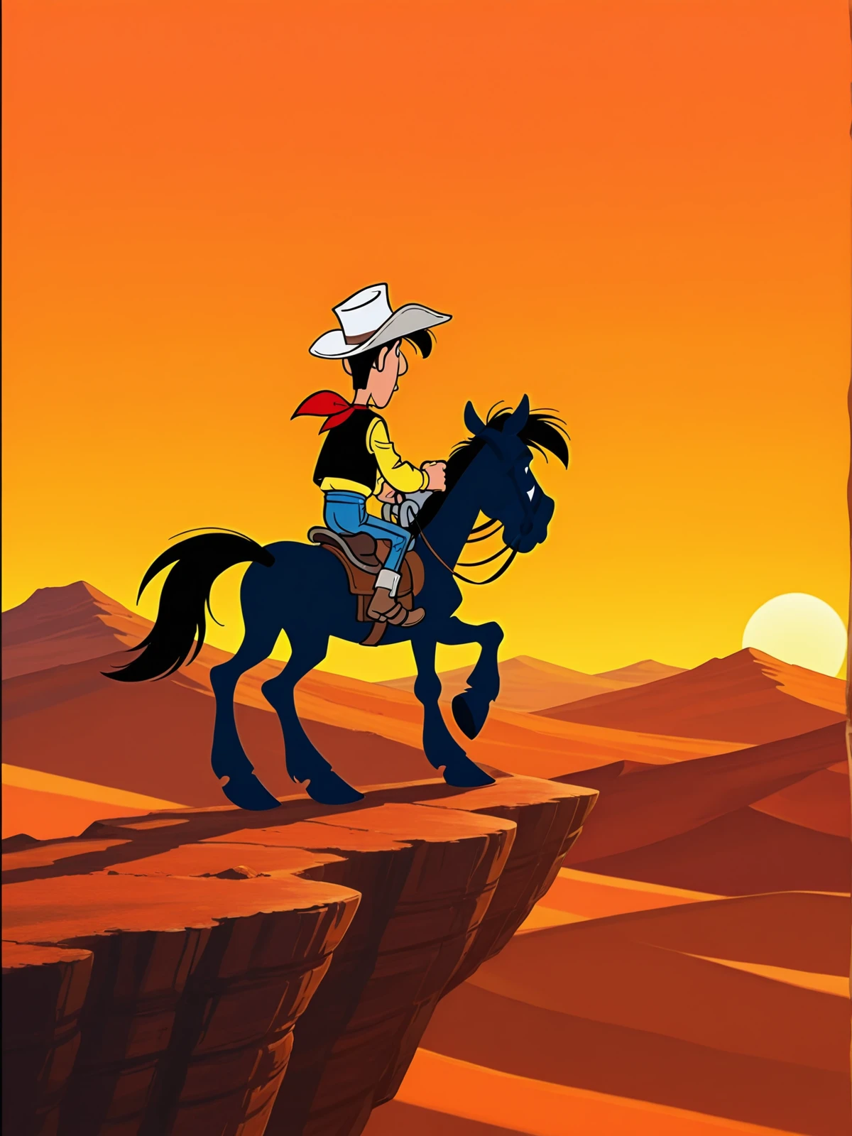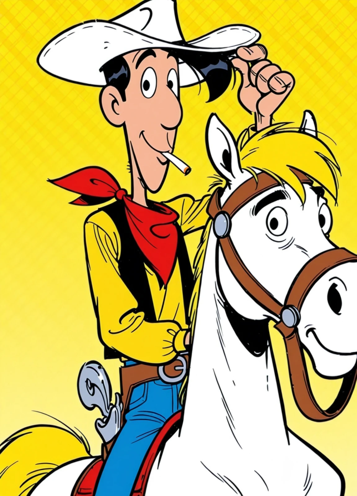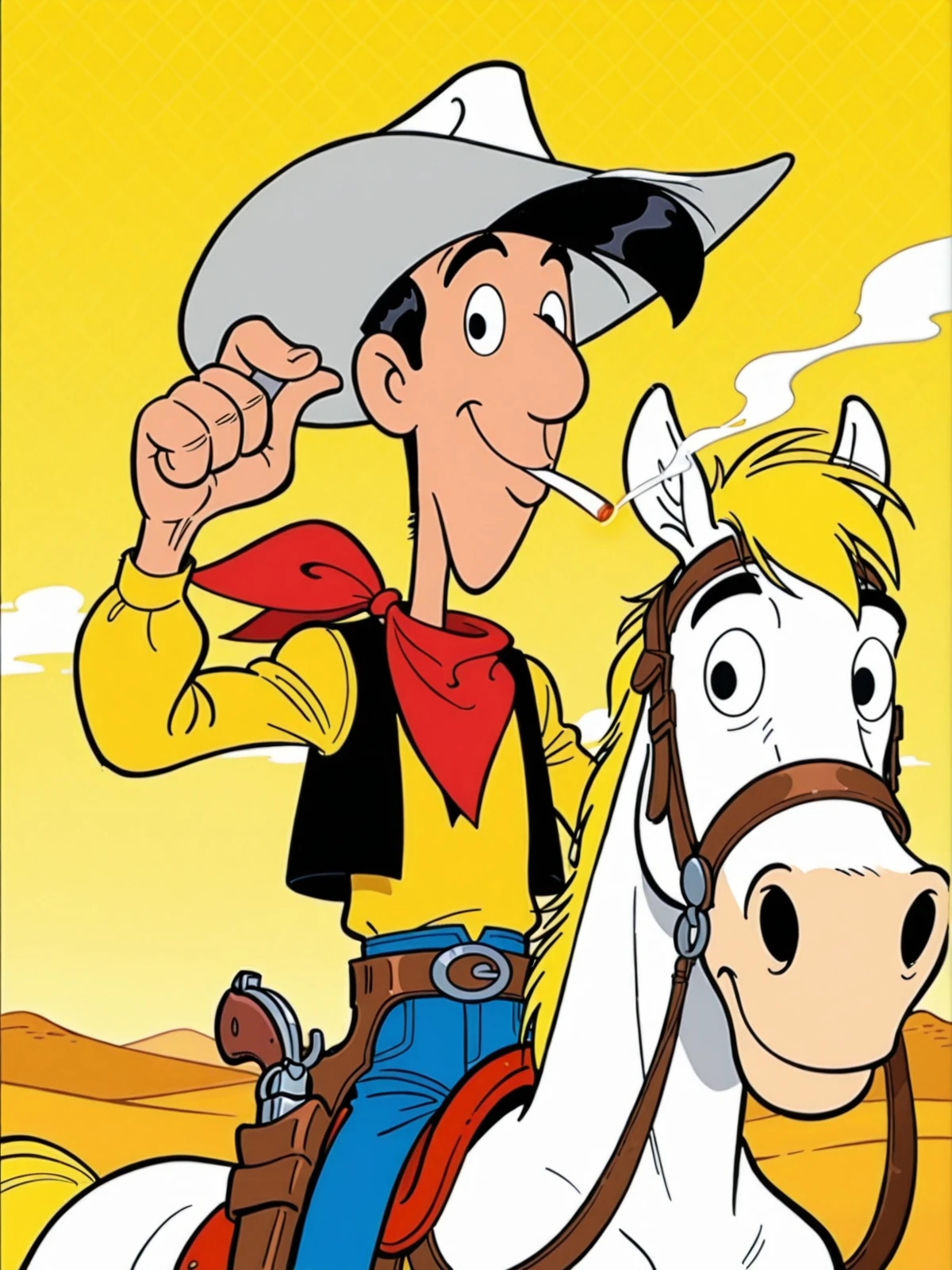 Main Prompts: (((1boy))), Lucky Luke, black hair, black eyes, cowboy western, western cartoon, toon \(style\), flat color,