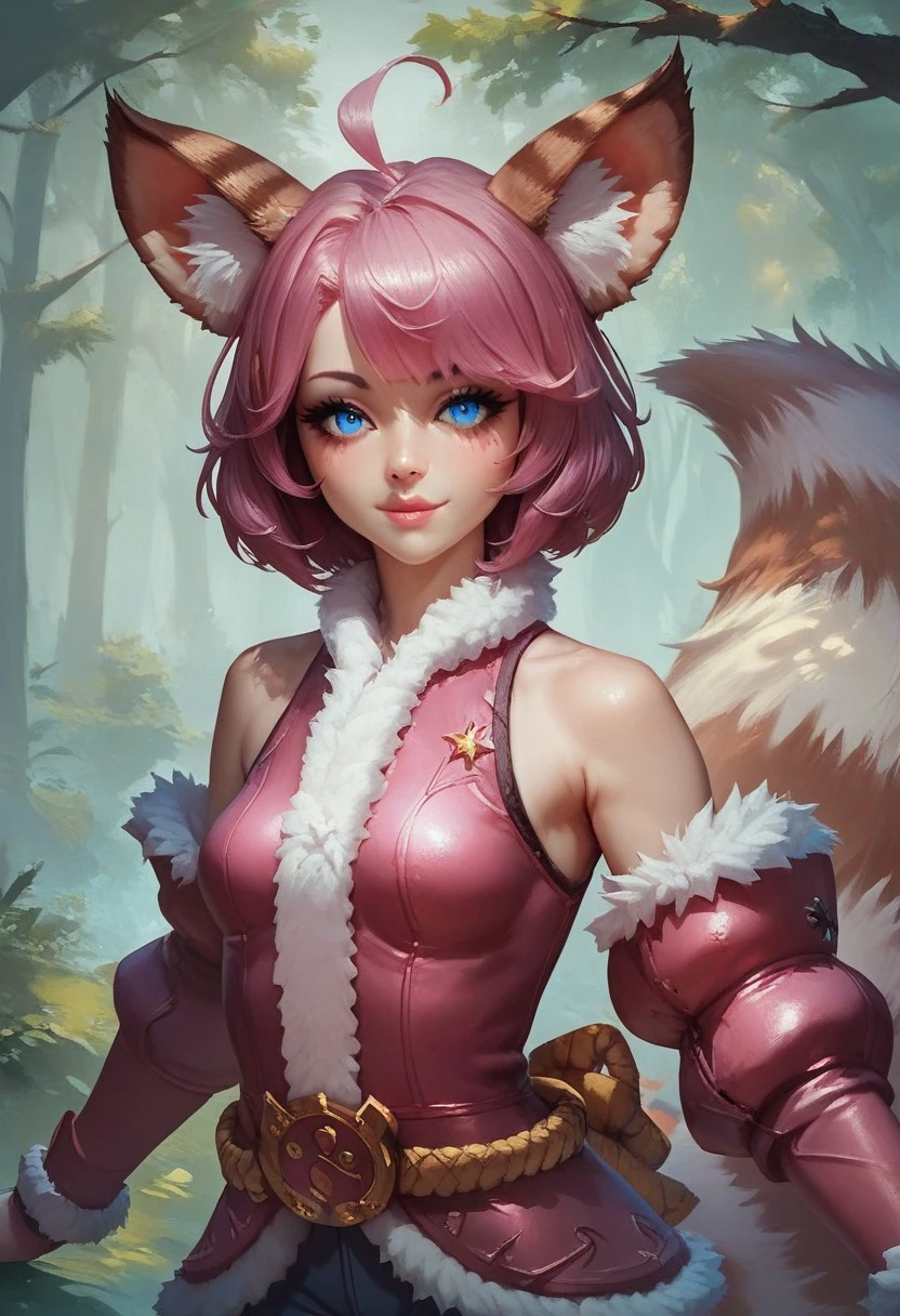 Nana, short hair, pink hair, blue eyes, animal ears, animal ear fluff, ahoge, small breasts, vest, fur trim, detached sleeves, belt, paw belt buckle, Shimenawa, striped tail, puffy pants, brown boots,