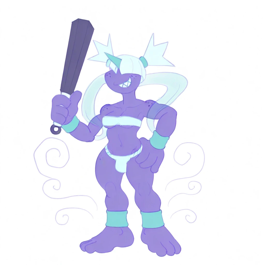 Tags: jinfu, colored skin, sharp teeth, breasts, freckles, hair over eyes, weapon, smile, teeth, barefoot, grin, oni, holding, navel, standing, single horn, 1other, sarashi, fundoshi, fuujin (mythology), hagoromo, club (weapon), holding club, hand on own hip, solo, full body, purple skin, bracelet, anklet, kanabou, short twintails