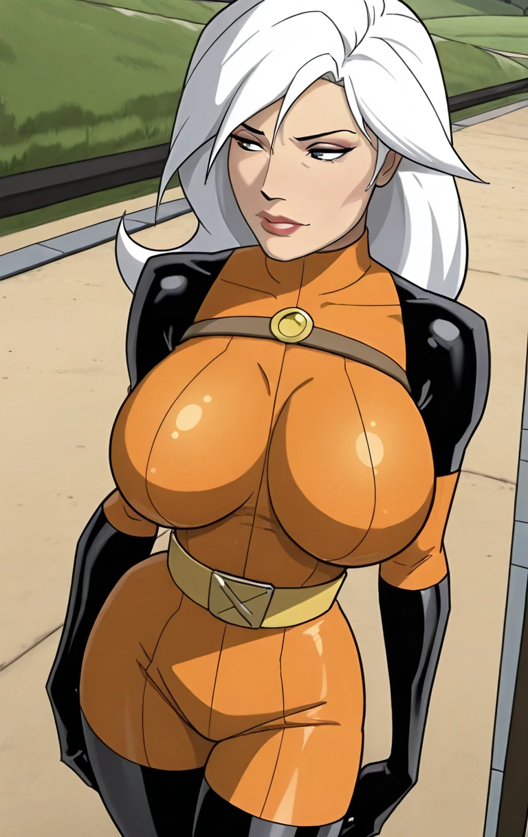 dr3ws4turd4yx, 1girl, solo, white hair, , gloves, long hair, belt, , elbow gloves, lipstick, makeup, bangs, turtleneck,